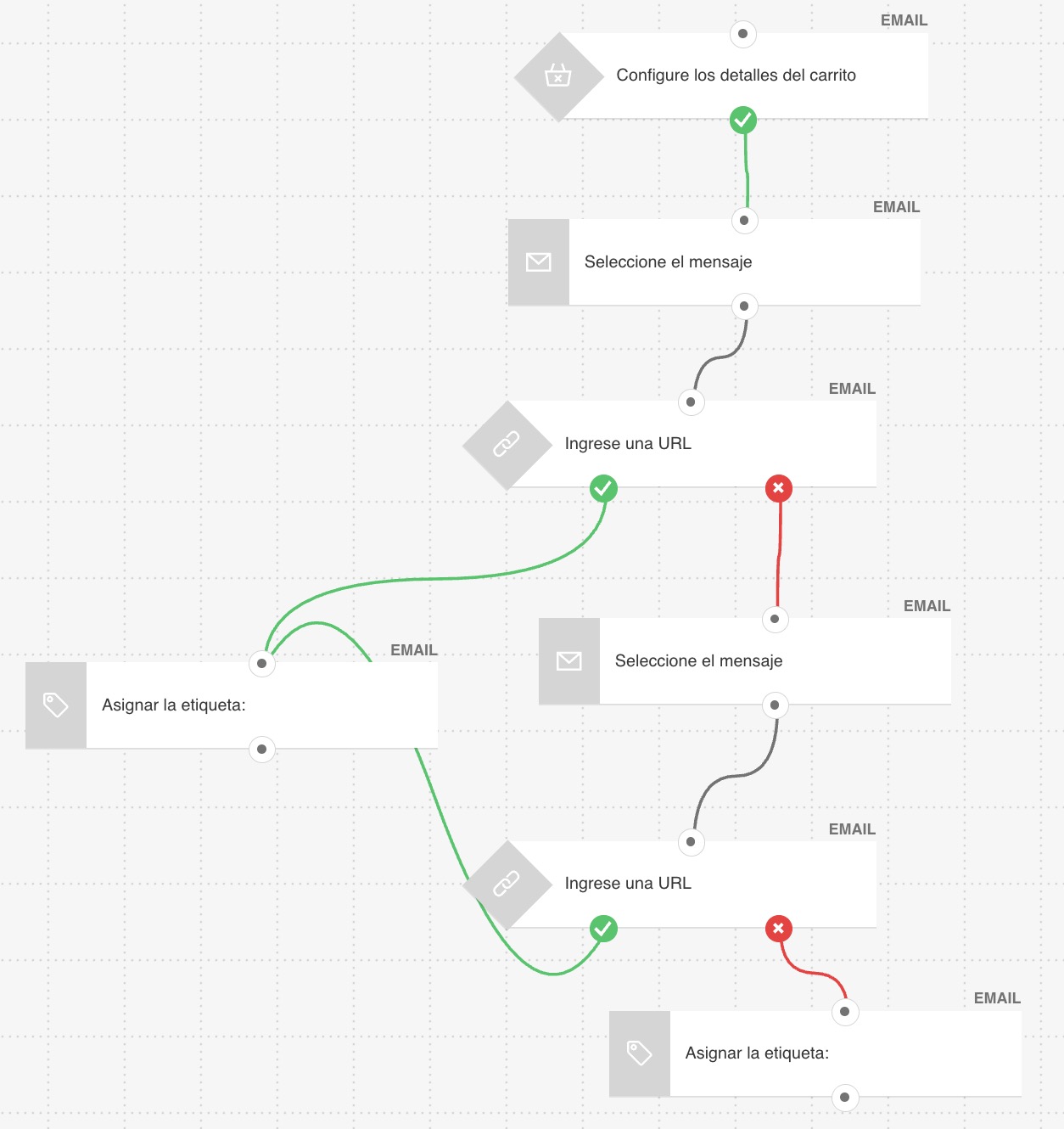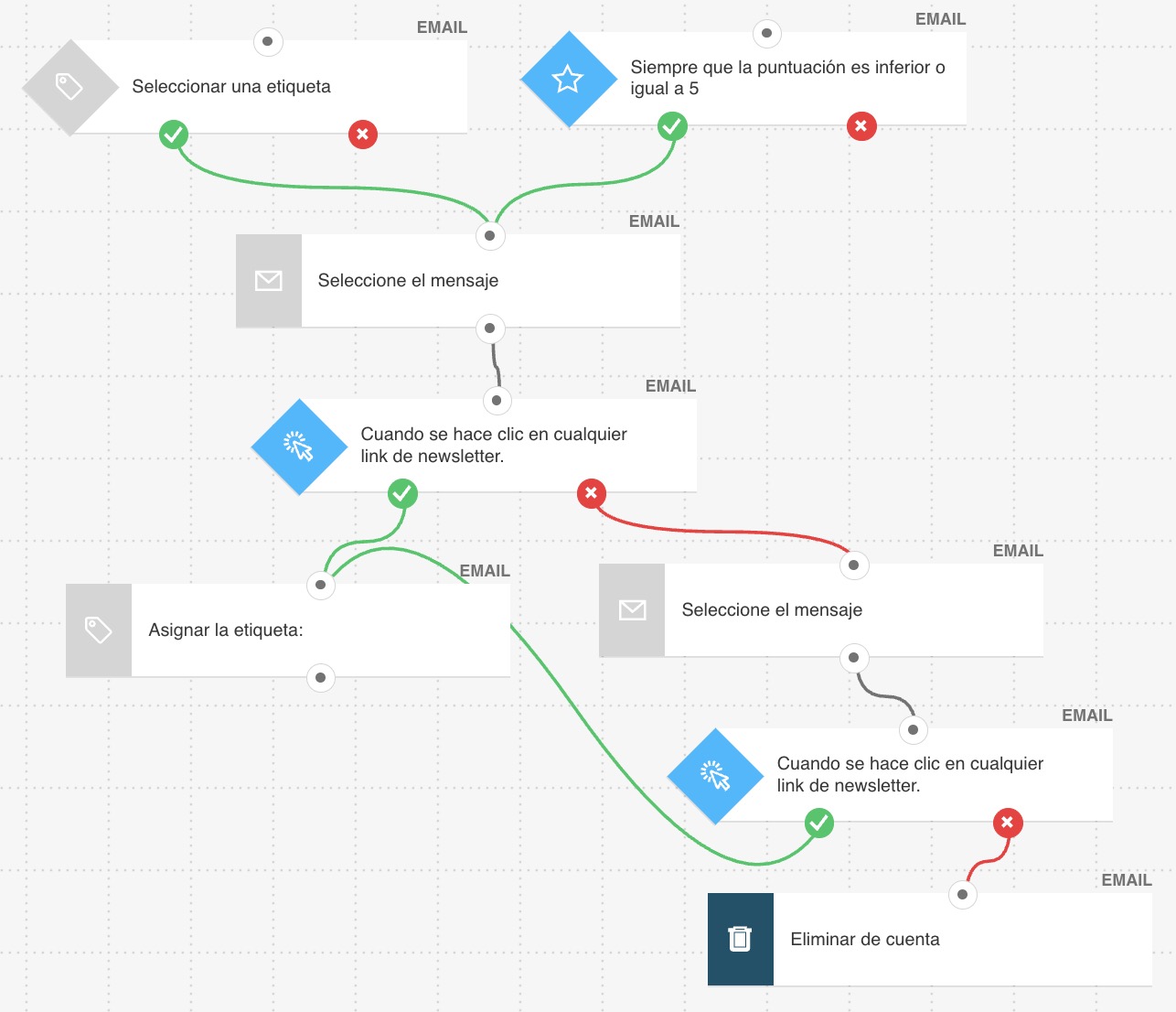 Crear este tipo de automatización en GetResponse es un juego de niños. De nuevo, hay una plantilla preestablecida que puedes modificar, creando un flujo de trabajo similar al del ejemplo siguiente: