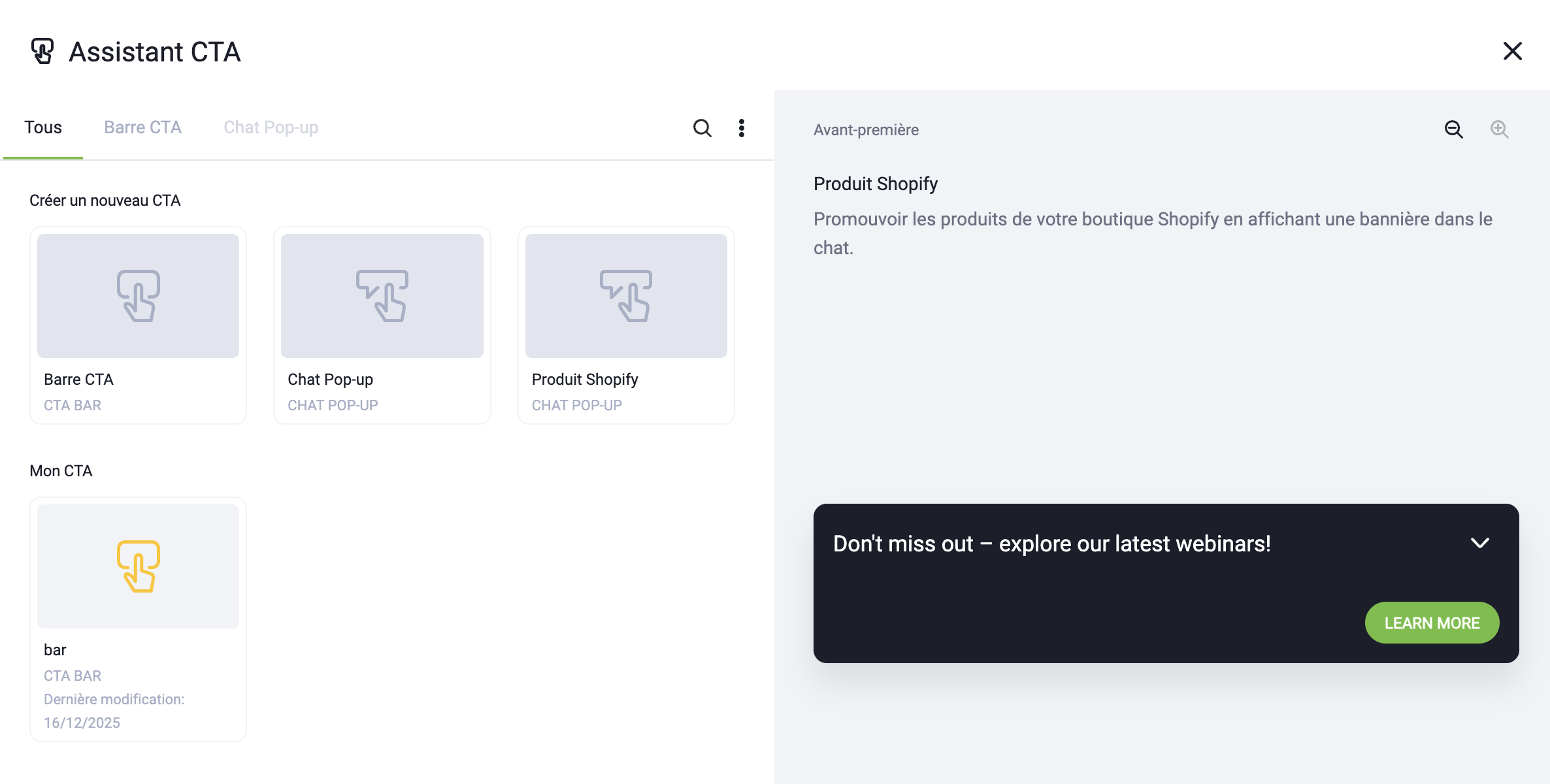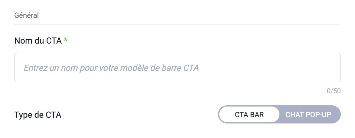 - sélectionnez le type de CTA — vous pouvez basculer entre CTA Bar et Chat Pop-up