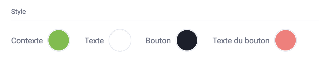 - Dans la section Style, sélectionnez les couleurs du Contexte, du Texte, du Bouton et du Texte du bouton.