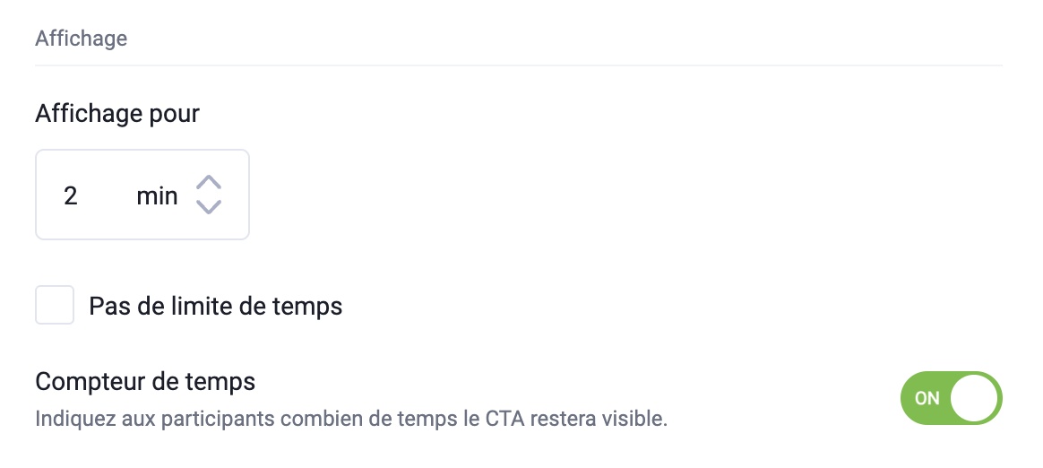 - Dans la section Affichage, l’option Pas de limite de temps est activée par défaut, ce qui signifie que votre CTA sera visible en permanence. Vous pouvez désactiver cette option et définir la durée d’affichage, ainsi que décider si vous souhaitez informer les participants de la durée pendant laquelle le CTA sera visible.