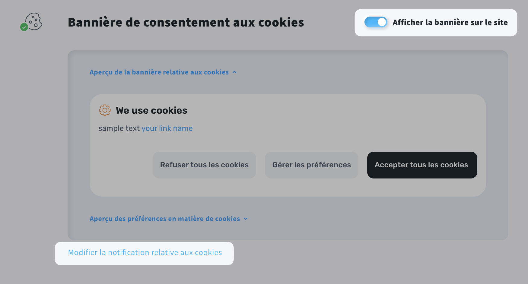 - Faites défiler jusqu’à la section Bannière de consentement aux cookies et activez l’option Afficher la bannière sur le site.