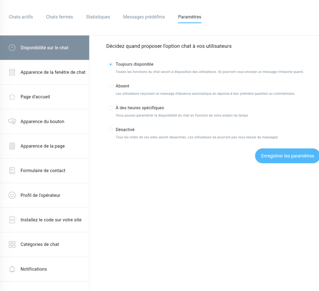 Une fois que vous avez personnalisé la disponibilité de votre chat, cliquez sur Enregistrer les paramètres.