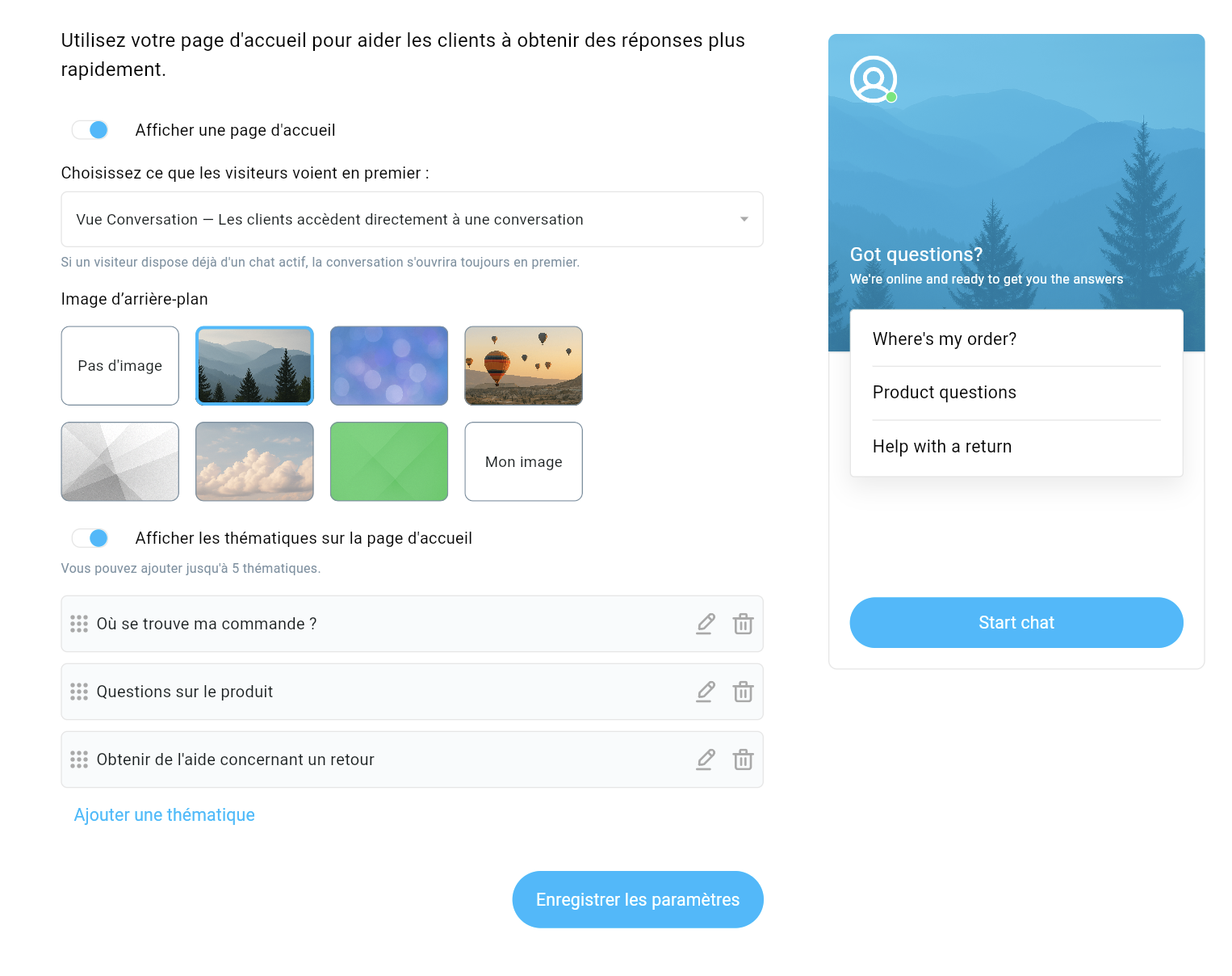 - Activez Afficher les thématiques sur la page d’accueil pour présenter des sujets suggérés aux visiteurs du chat. Vous pouvez ajouter jusqu’à cinq sujets. En cliquant sur un sujet, il sera ajouté à la discussion sous forme de texte. Vous pouvez réorganiser leur ordre par glisser-déposer, modifier leur texte ou les supprimer à l’aide de l’icône à droite.