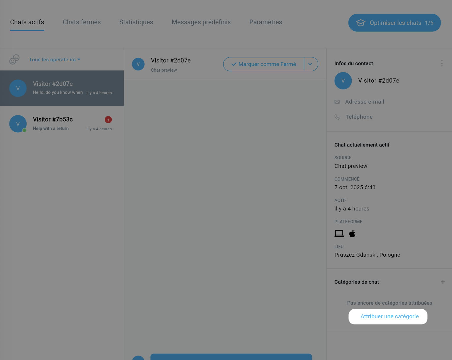 Vous pouvez Attribuer une catégorie aux chats actifs dans le coin inférieur droit.