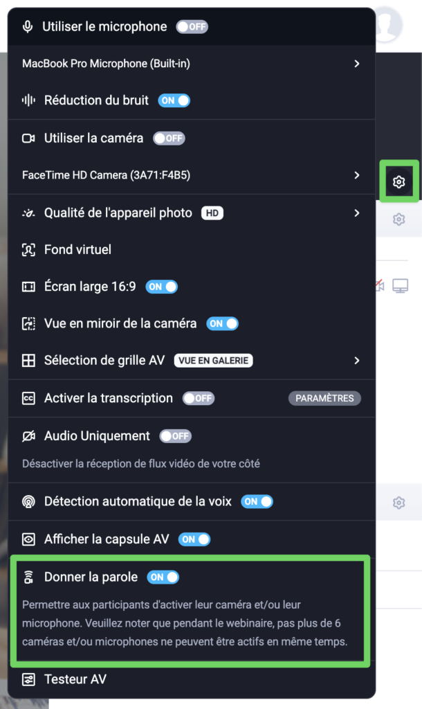 Vous pouvez activer l’option Donner la parole en cliquant sur Paramètres audio/vidéo pendant le webinar et en la basculant sur ON.
