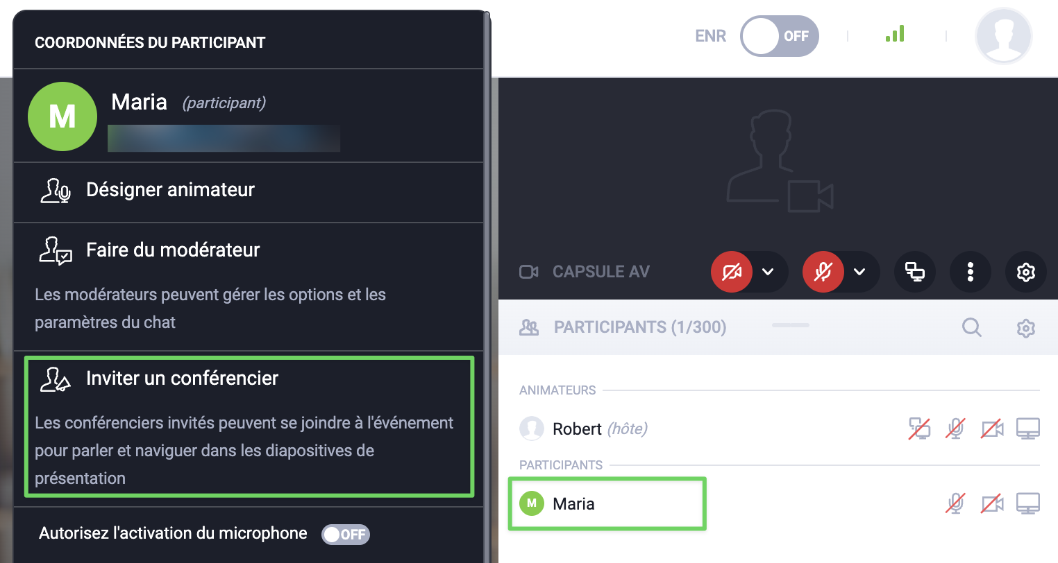 Les conférencier peuvent activer la vidéo et le son, utiliser le partage d’écran, changer les diapositives de la présentation, y ajouter des notes ou participer à une discussion dans le chat dans l’onglet Votre équipe. Par défaut, il n’y a pas d’accès aux données des participants. Un intervenant invité prend la place d’un présentateur. L’hôte peut définir n’importe quel participant comme intervenant invité. Pour ce faire, cliquez sur le nom du participant dans la liste des Participants et sélectionnez Inviter un conférencier dans la section Détails du participant .