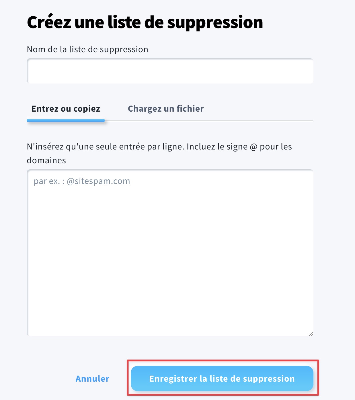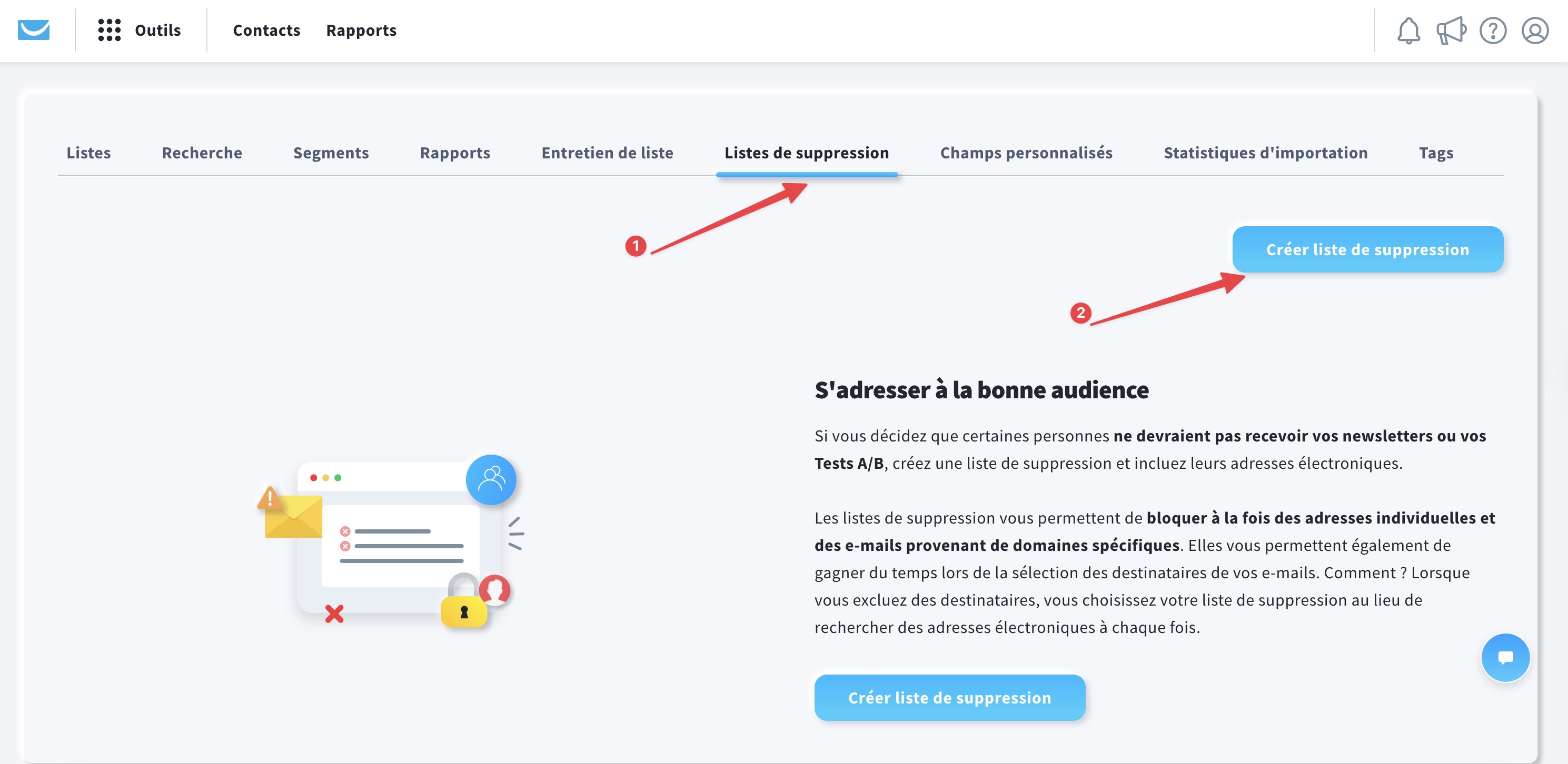 Vous devez utiliser une liste de suppression pour exclure des adresses ou des domaines spécifiques de la réception de vos newsletters. Pour ce faire, vous devez ajouter des règles de suppression.