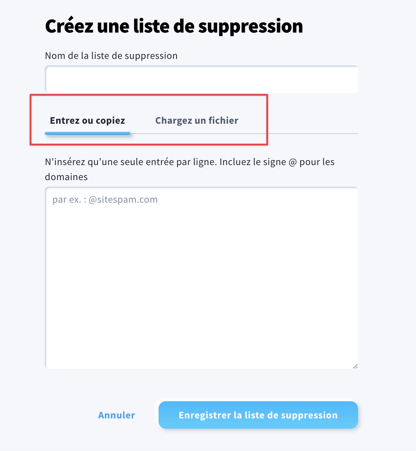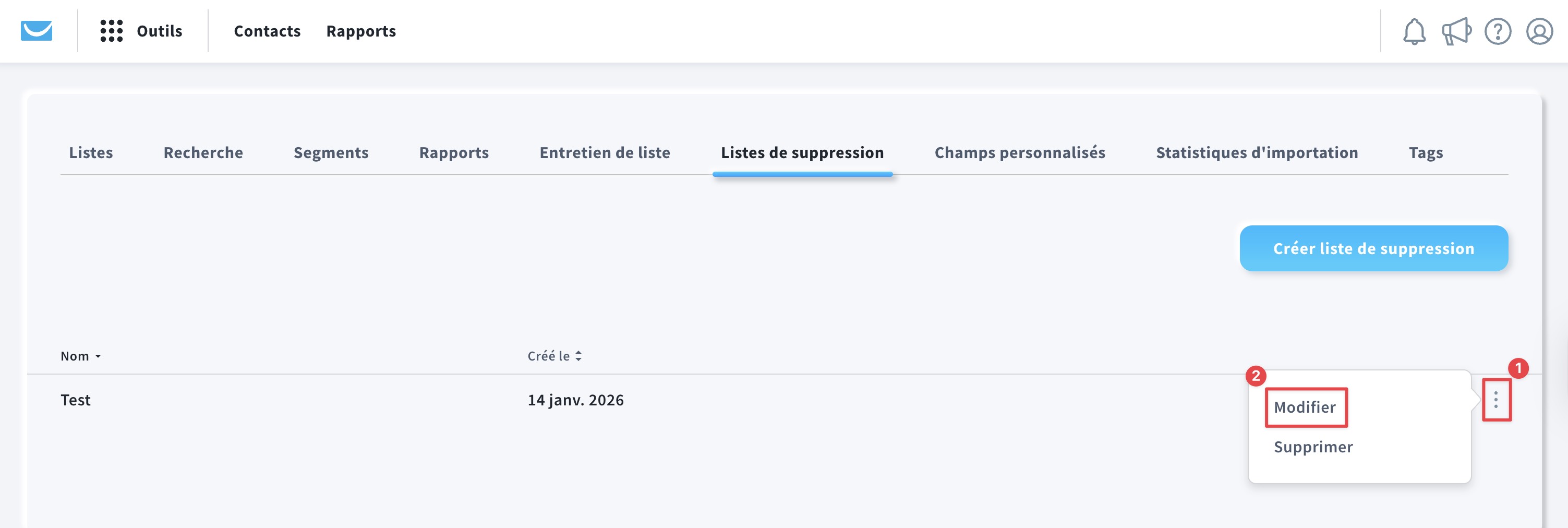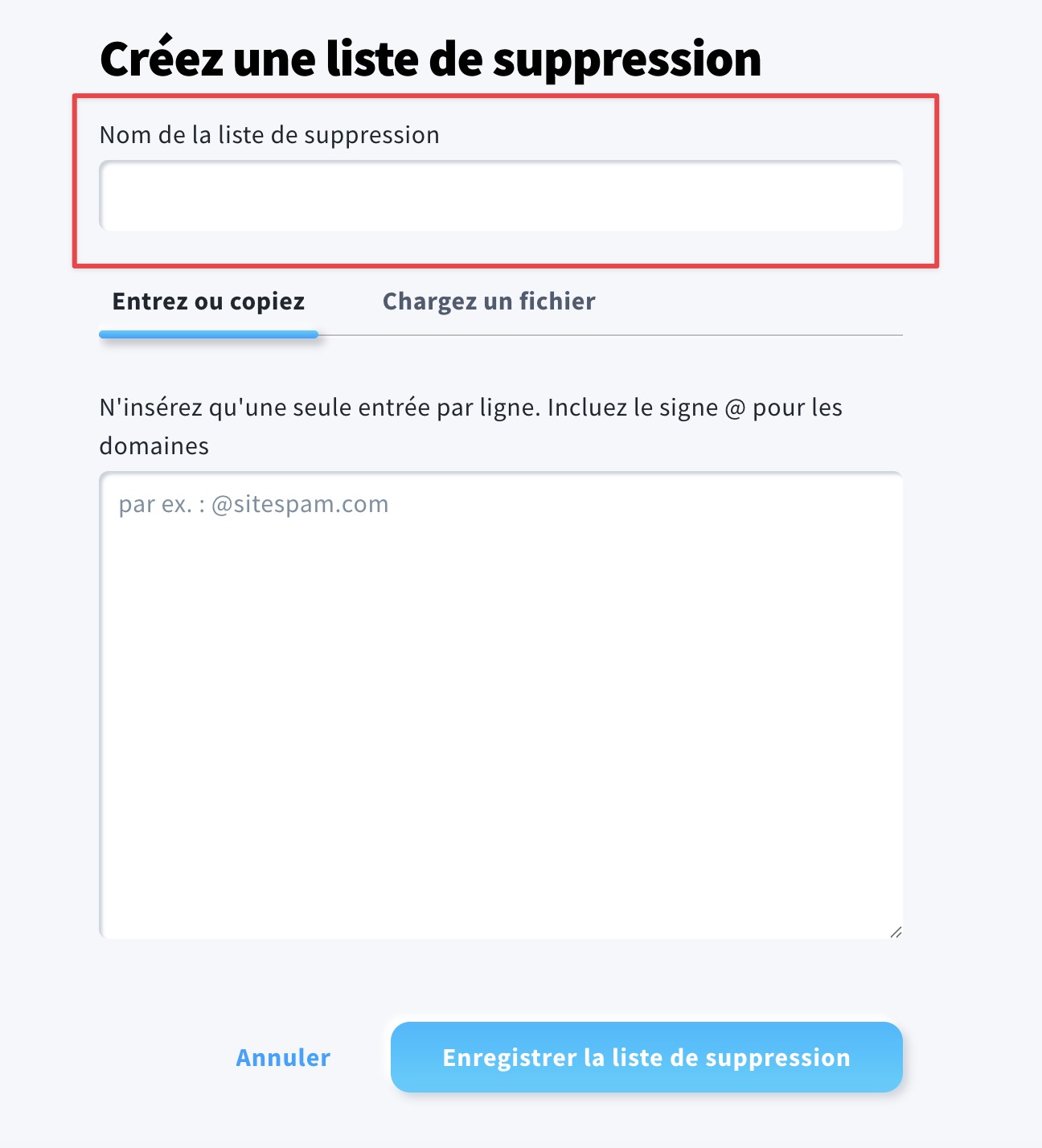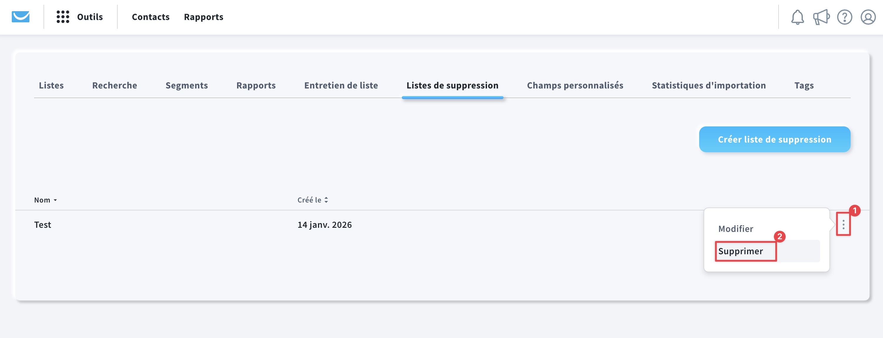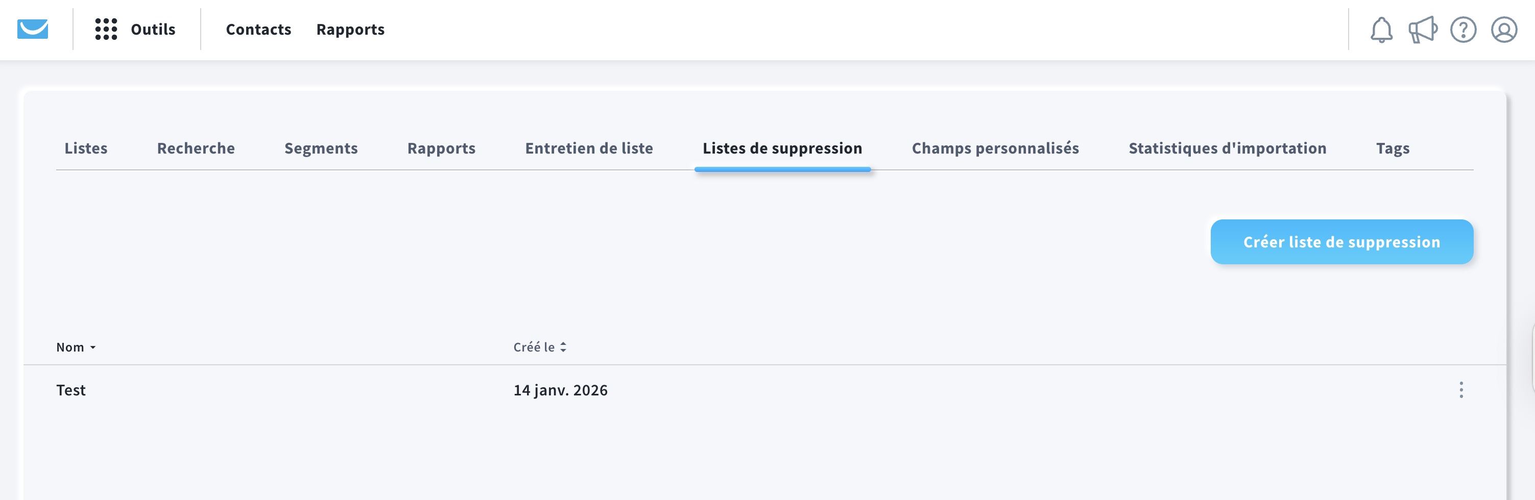 Une fois que vous avez créé une liste de suppression, vous revenez automatiquement à la page Listes de suppression.