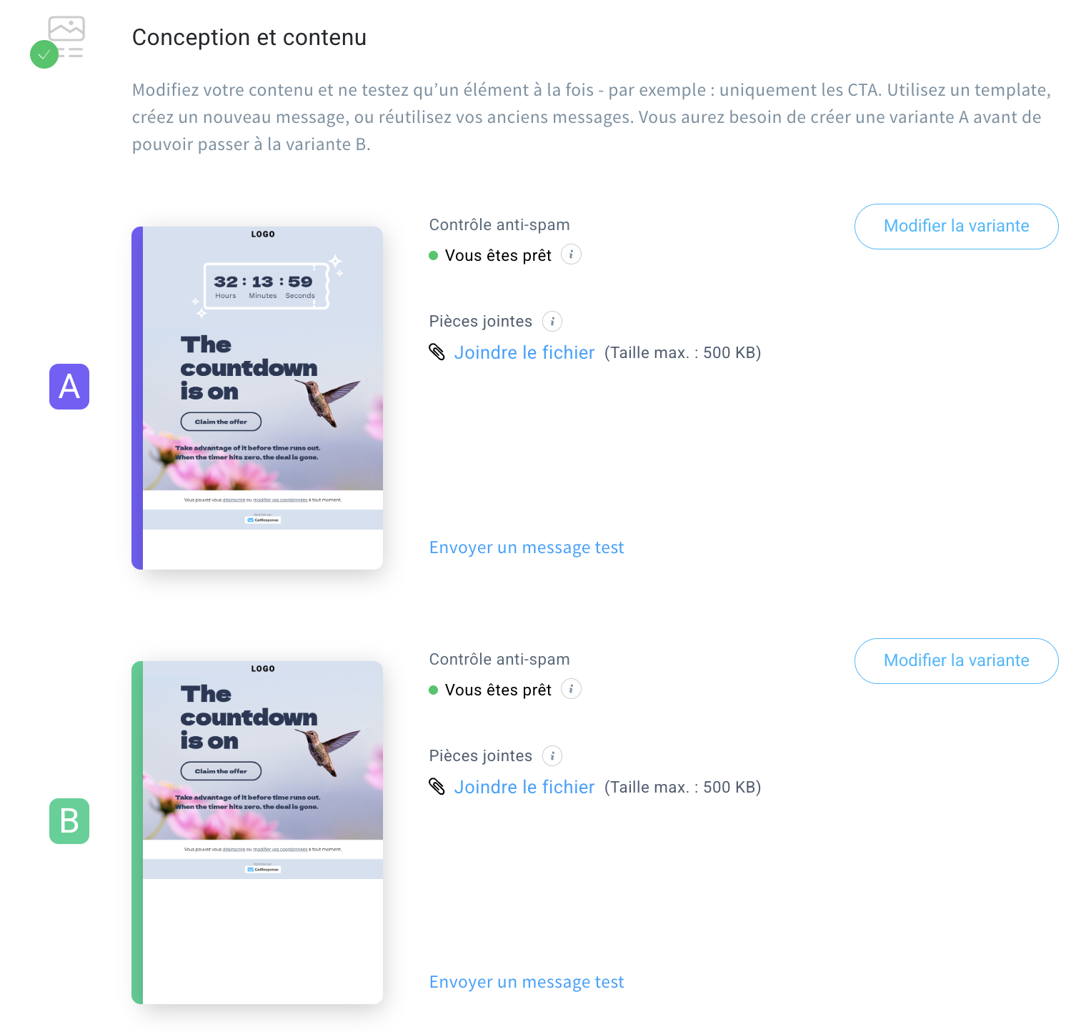 Tester, tester, tester. Si vous travaillez dans le marketing ou avez de l’expérience dans ce domaine, vous connaissez probablement l’importance de réaliser des tests pour évaluer et améliorer vos performances. La fonction de test A/B vous permet de créer différentes variantes de votre message et de déterminer celle qui fonctionne le mieux auprès de votre public. Il s’agit là d’un atout non négligeable, car tester un message revient à tester trois éléments à la fois : l’objet, l’aperçu ou le corps du message.