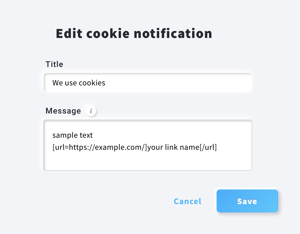 - Click on the Edit cookie notification link to change the title, message, decline link text, and confirmation button text. To include a link in your cookie notification use the following format:
