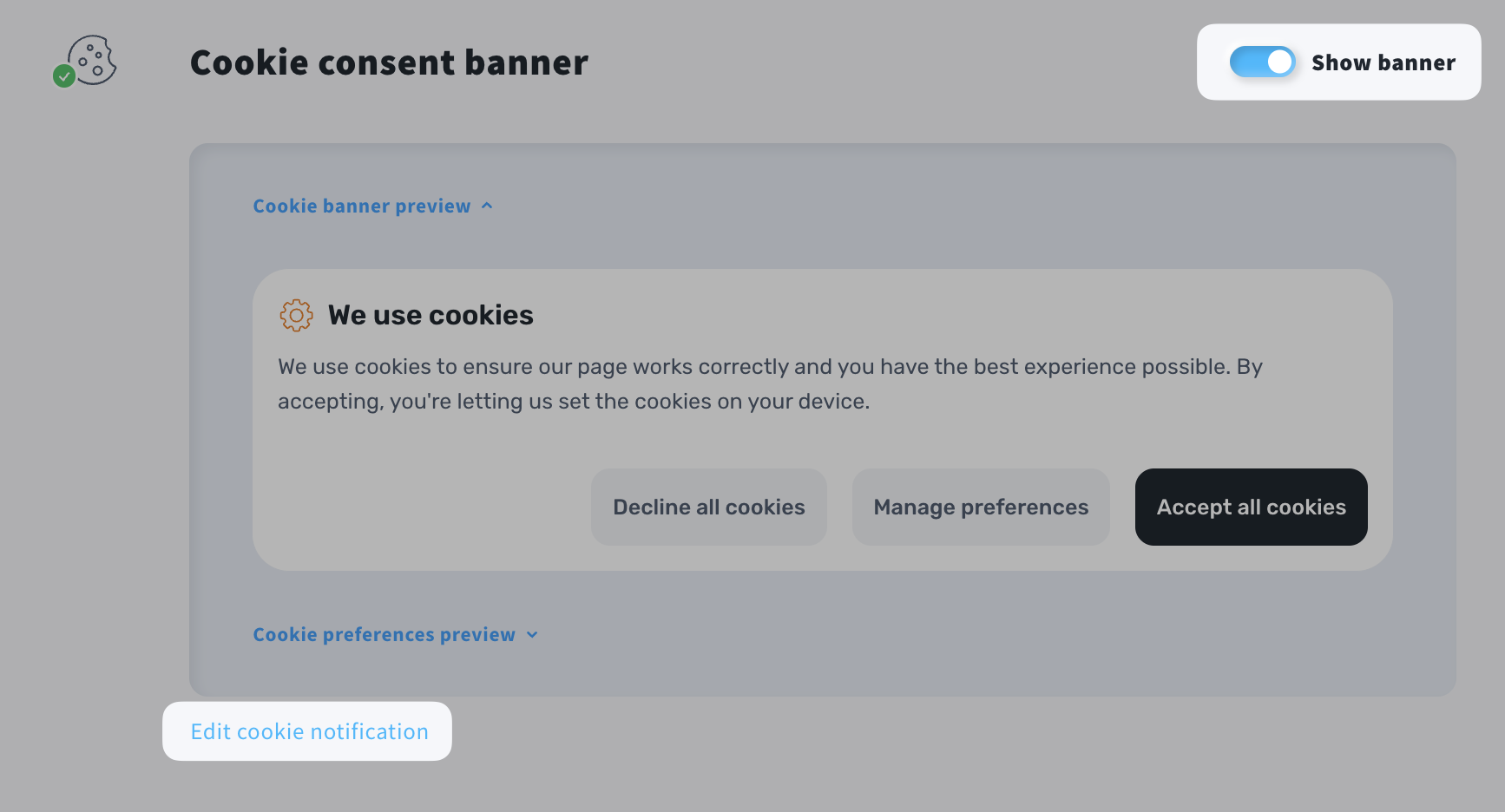 - Scroll down to the Cookie consent banner section and toggle the Show banner option.