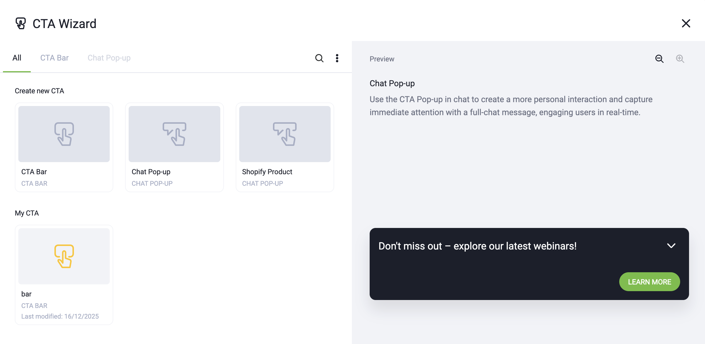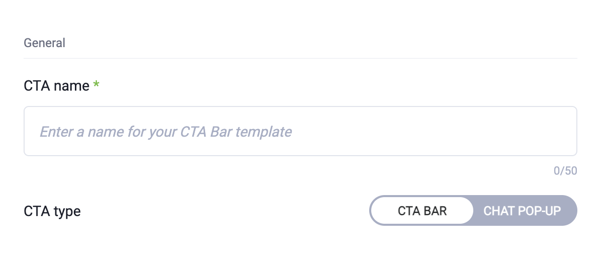 - select the CTA type – you can switch between CTA Bar and Chat Pop-up