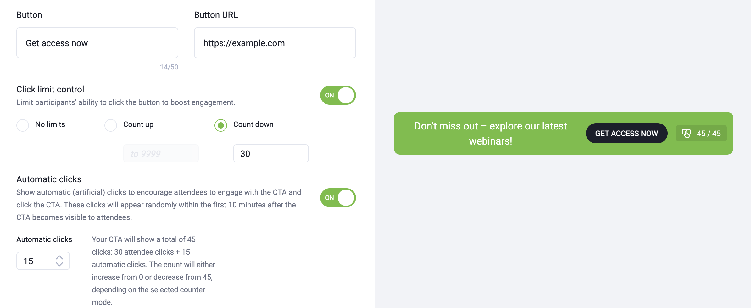 - When Click limit control is enabled, you can also enable Automatic clicks using the ON/OFF slider. This generates simulated (non-real) clicks to create early activity and encourage attendees to engage with the CTA. These artificial clicks are added on top of the configured click limit – for example, if the limit is set to 45 clicks, the counter will show 45 real attendee clicks + extra clicks based on the amount you configure. The artificial clicks are distributed randomly within the first 10 minutes after the CTA becomes visible.