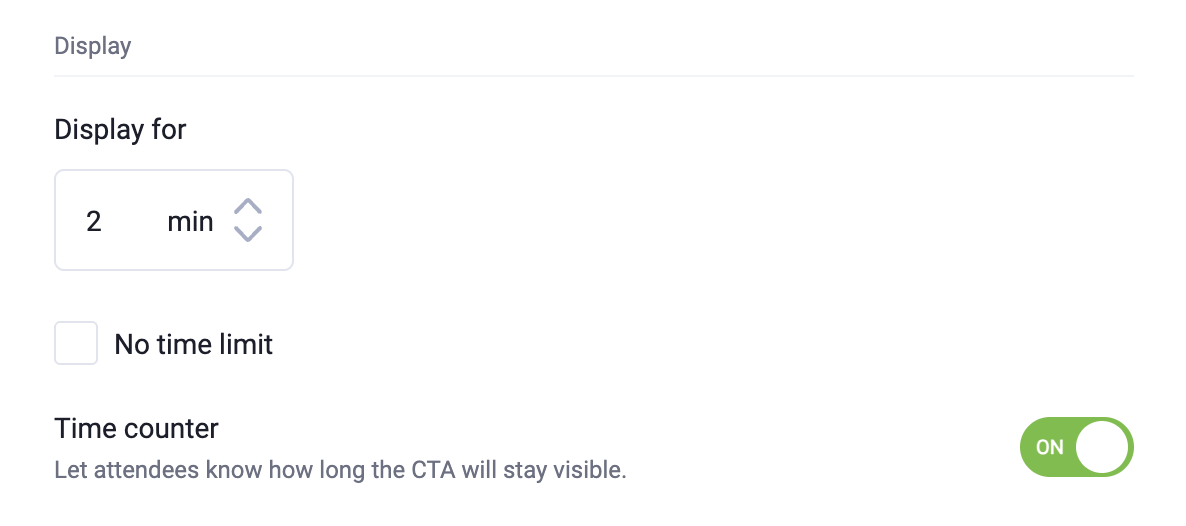 - In Display section, the No time limit option is enabled by default, which means your CTA will be visible all the time. You can uncheck this option and set how long to display it for, and also decide whether you want to inform participants about the duration for which the CTA will be visible.