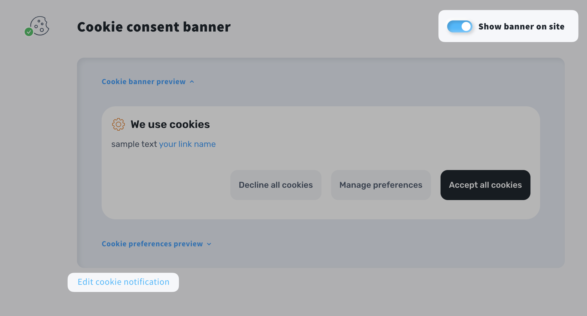 Click on the Edit cookie notification link to change the title, message, decline link text, and confirmation button text.