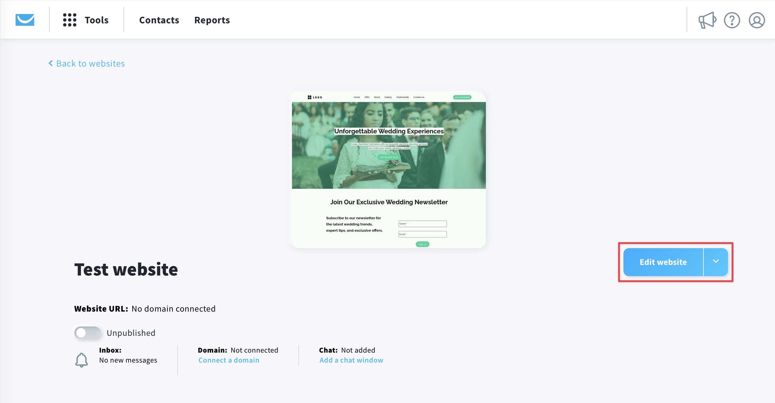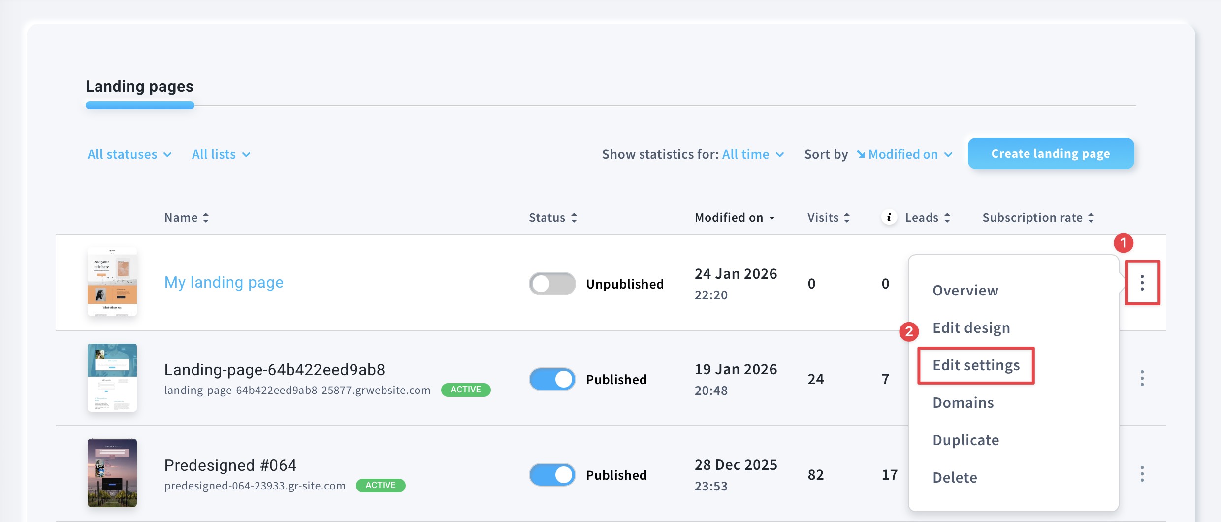 - Choose your landing page, hover the mouse over the action menu and choose Edit settings.
