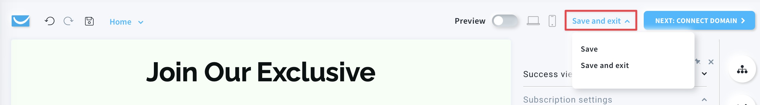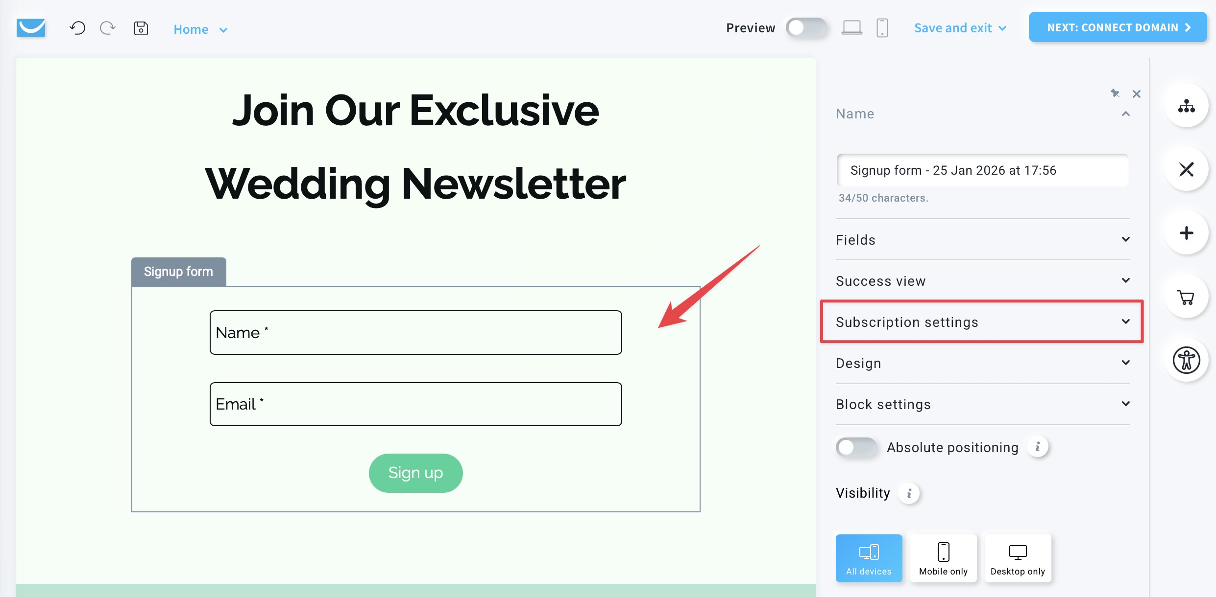 - Click on the sign-up form element and expand the Subscription settings tab.