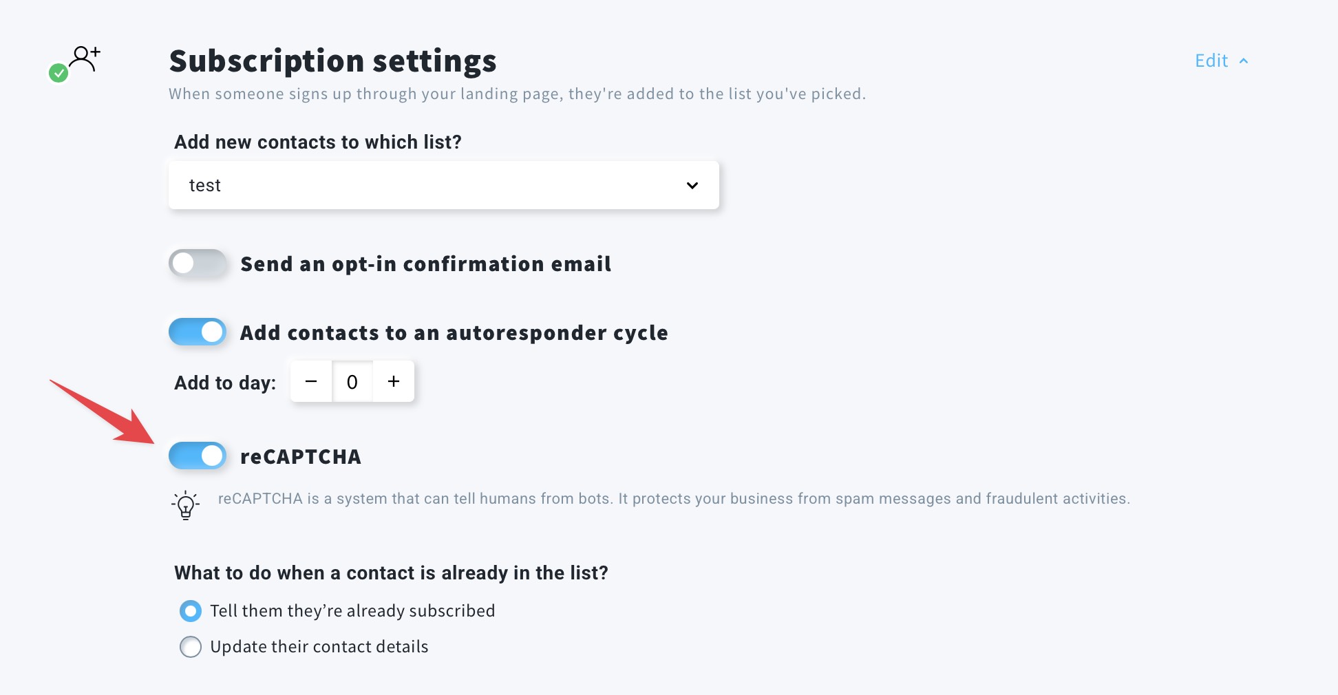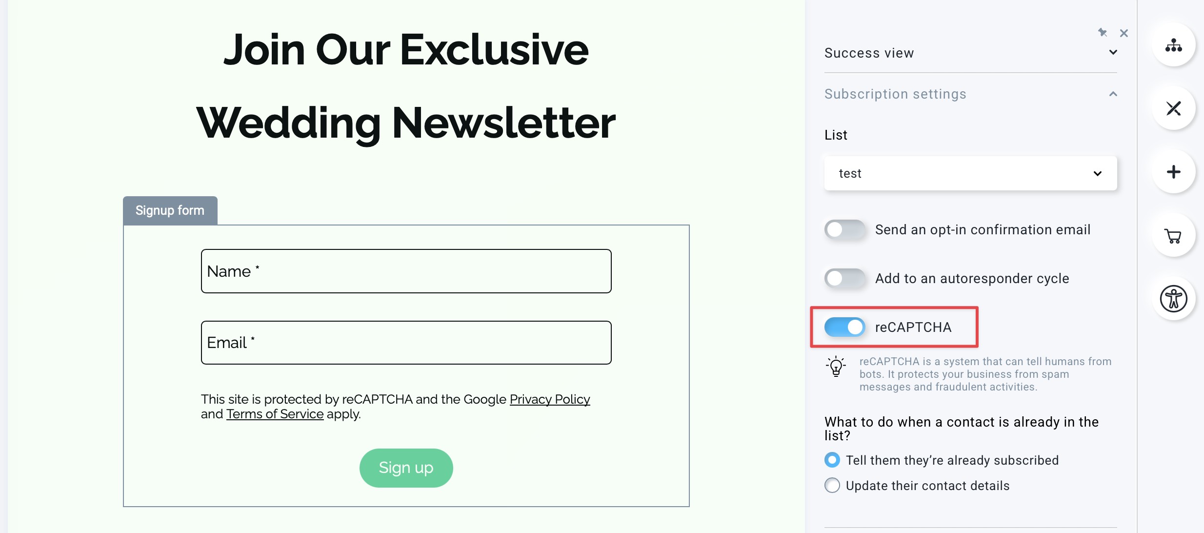 - Add reCAPTCHA to your forms to block automated bot signups before they reach your list. It helps distinguish real users from malicious traffic by analyzing behavior in real time, reducing fake entries, improving data quality, and protecting your list with minimal friction for genuine subscribers.