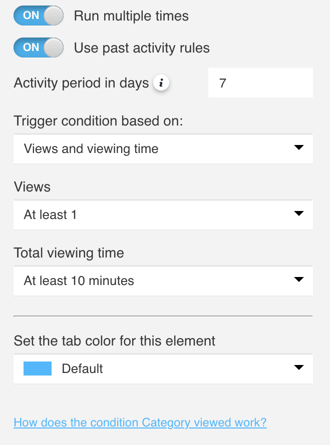 Choose how the workflow should evaluate the visitor’s activity:- Views – the visitor must view the selected category at least 1, 2, 3, 4, 5, or 10 times within the defined activity period to proceed to the next element.