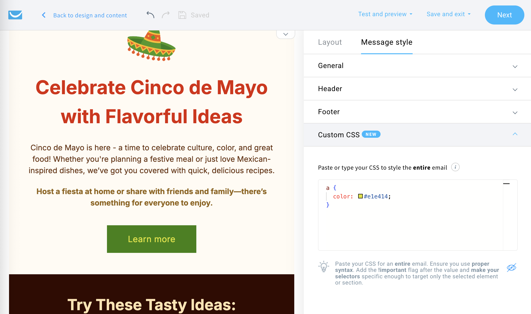 Custom CSS allows you to define your own styling rules that apply to the entire message or any message element. When you add your code in the Custom CSS element, the styles you add are loaded after (i.e., take priority over) the default styles that come from the editor.
