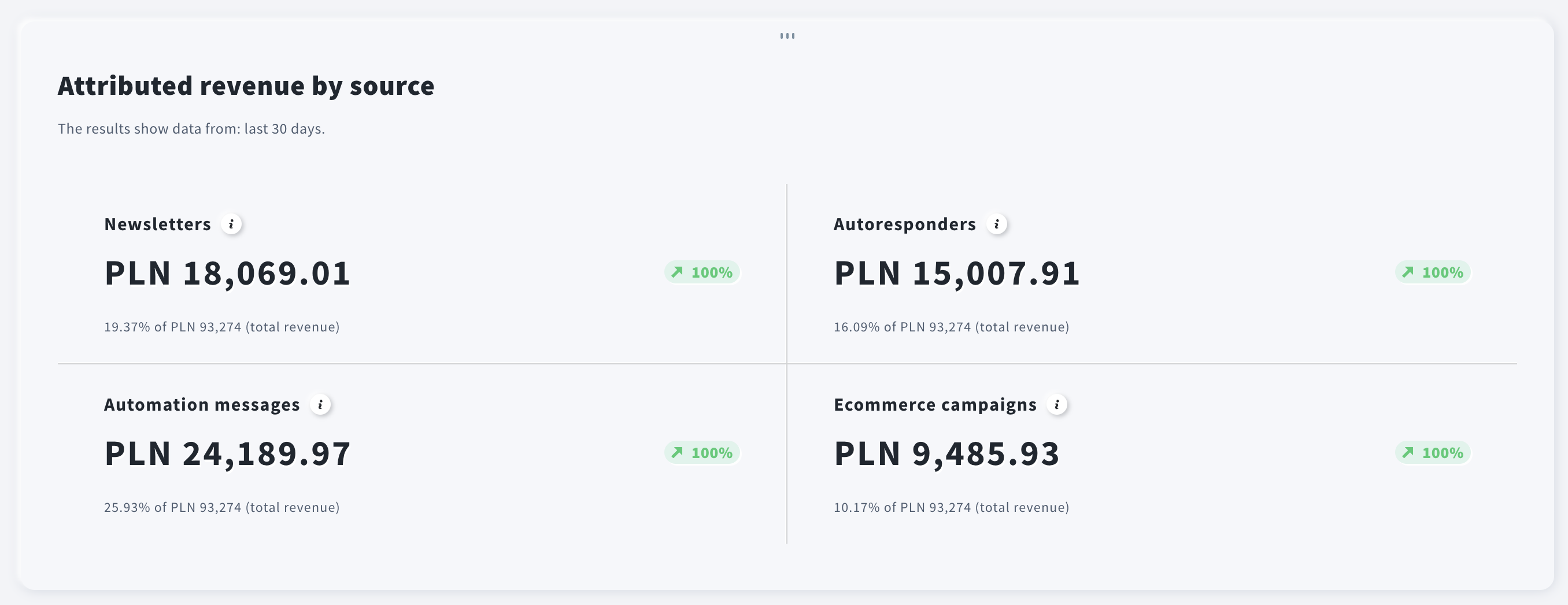 Avg. order value (attributed) is the total attributed revenue divided by the number of attributed orders – those converted through GetResponse. It shows the average amount spent per order. Use it to evaluate pricing and the impact of strategies like cross-selling, discounts, or free shipping.