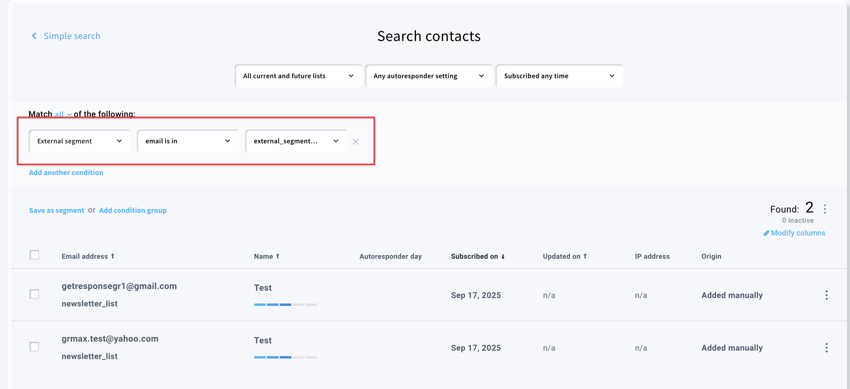 Note: The segment above contains only 2 subscribers out of the 3 that were uploaded. This is because the address unexisting_email@example.com is not in the GetResponse list.