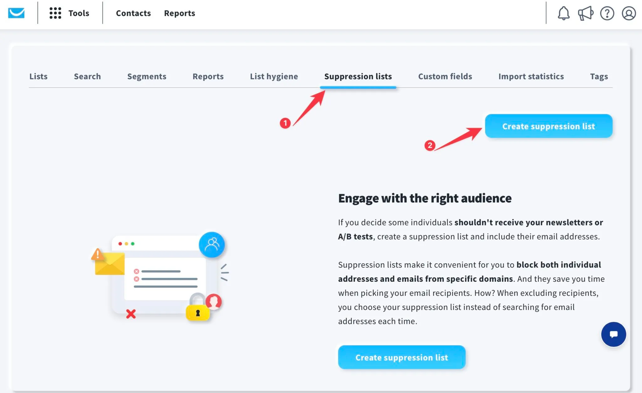 - Go to Contacts > Suppression lists.