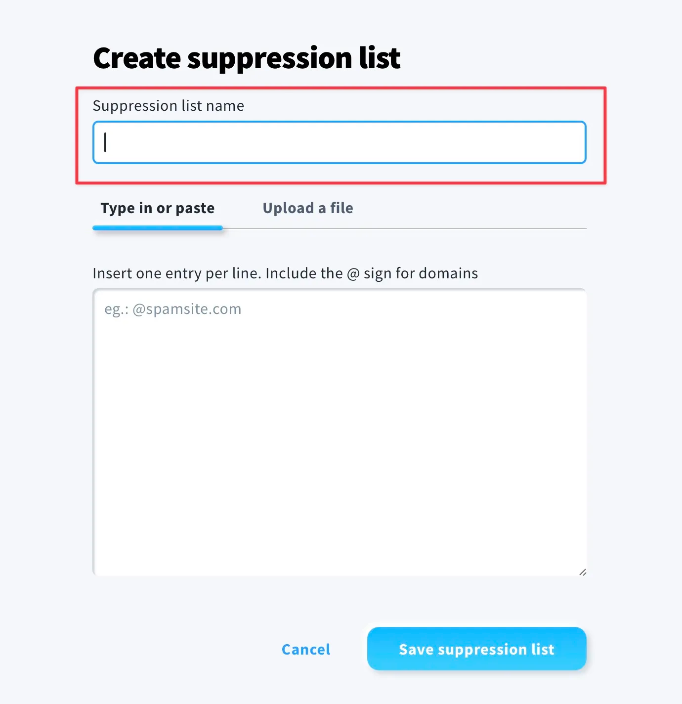 - The Create suppression list page will open. Enter your suppression list name (required). The list name can be 1-64 characters long. All characters are allowed, but your list name can’t be just a space ( ). Emojis are turned into an underscore ( _ ).