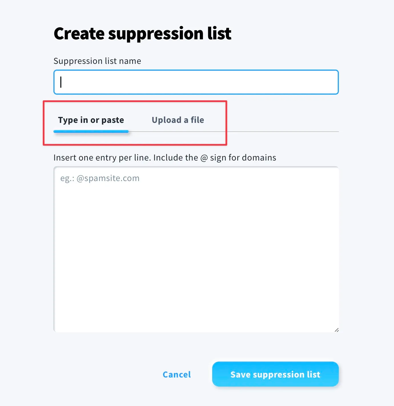 - To add new rules, select Add suppression rule. Next select Type in or paste or Upload a file. Then, follow the steps for adding suppression rules. Click Save when you are done.