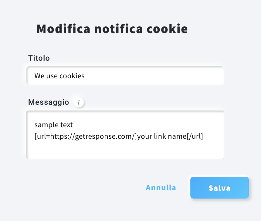 Ti offriamo l’opzione per abilitare un banner sui cookie in GetResponse per aiutarti a rispettare tali regolamenti, ma non garantiamo che seguire i nostri suggerimenti o utilizzare la nostra barra modello assicuri la conformità alle leggi applicabili all’uso dei cookie sul tuo sito web. Ti consigliamo di consultare un esperto legale sui requisiti esatti per l’uso dei cookie.