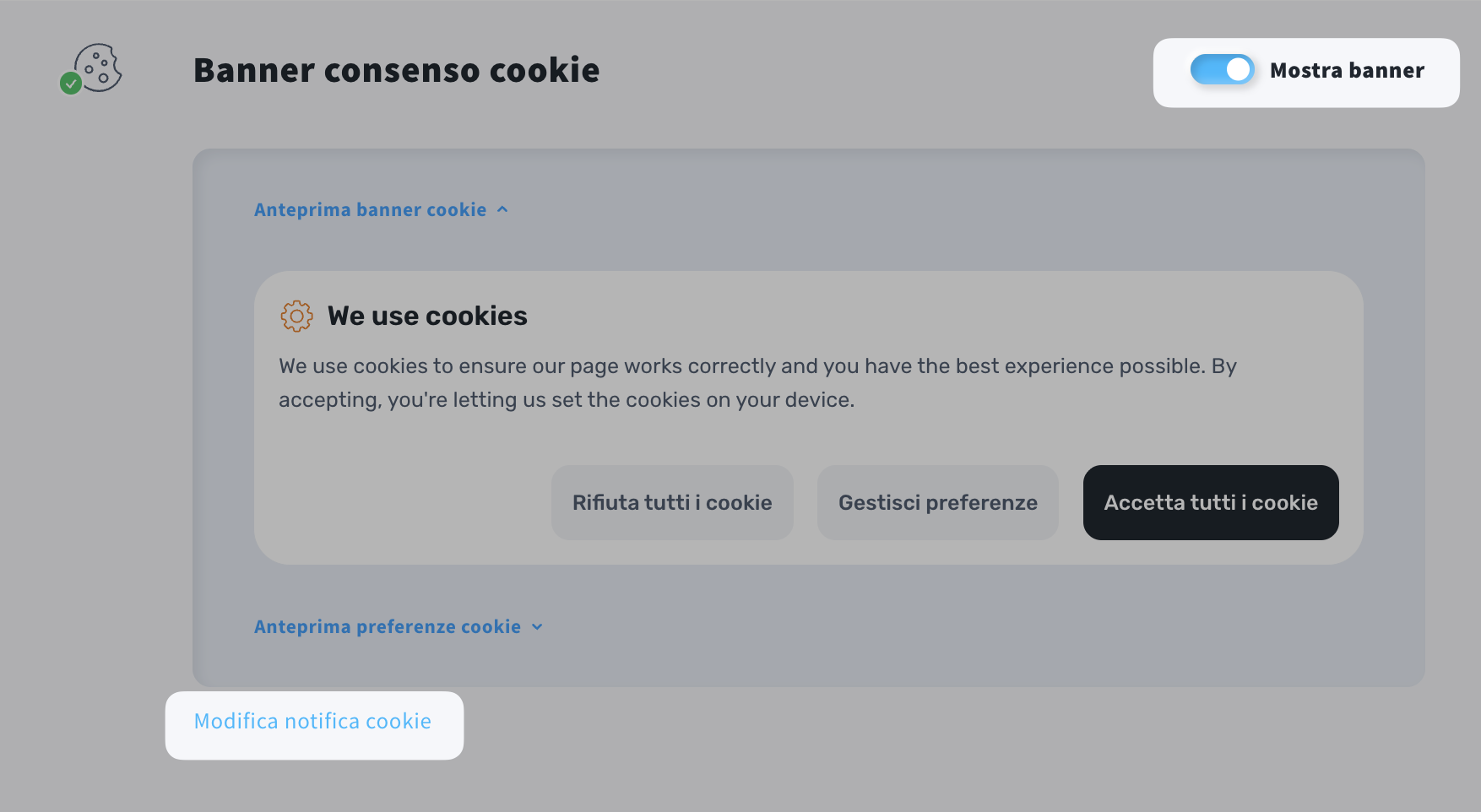 - Scorri verso il basso fino alla sezione Banner consenso cookie e attiva l’opzione Mostra banner.