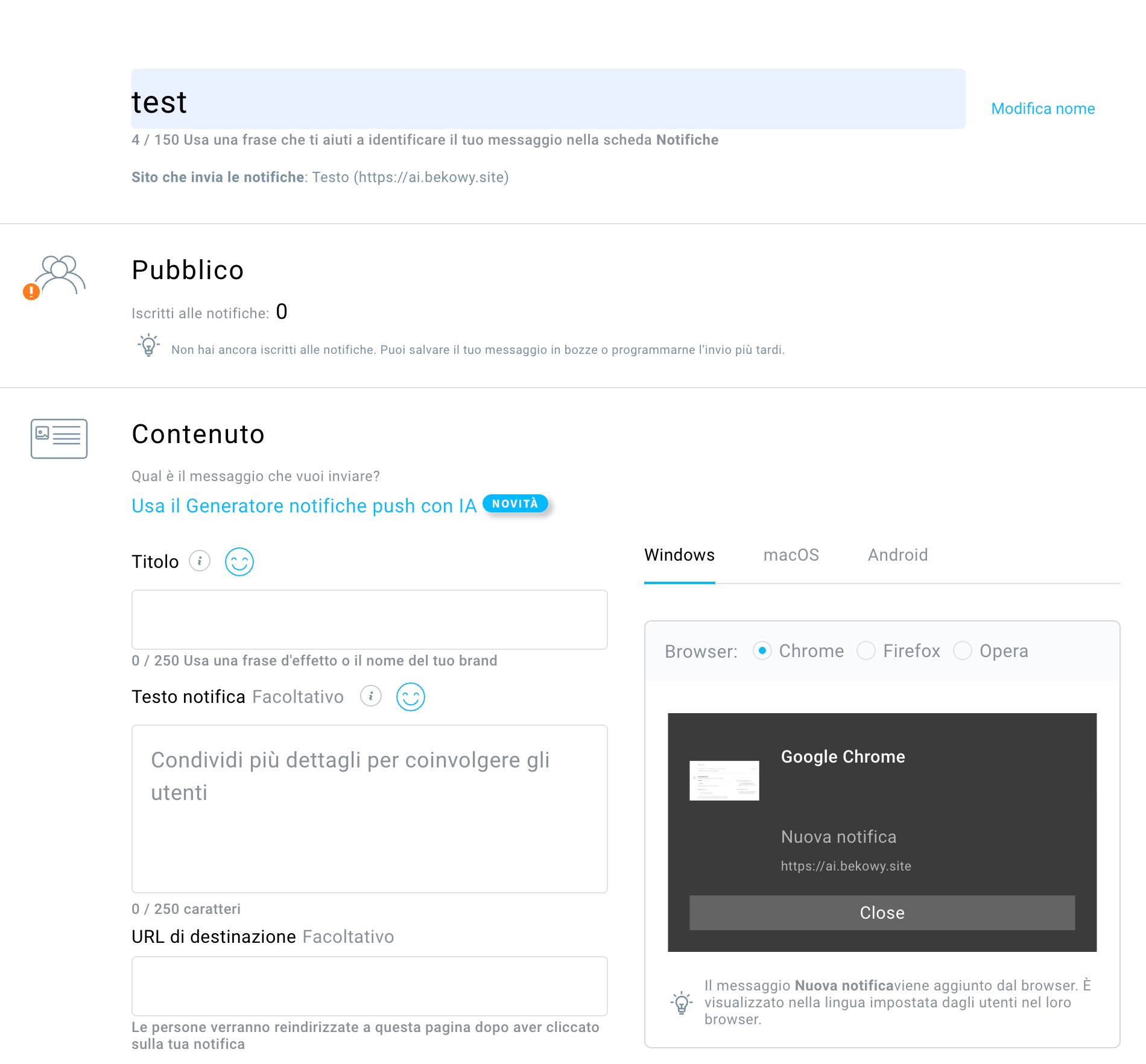 Nota: diversi browser e dispositivi possono avere limiti di caratteri differenti. Se vuoi che la notifica venga visualizzata correttamente da tutti gli iscritti, è meglio non creare notifiche troppo lunghe, poiché potrebbero non essere visualizzate completamente.