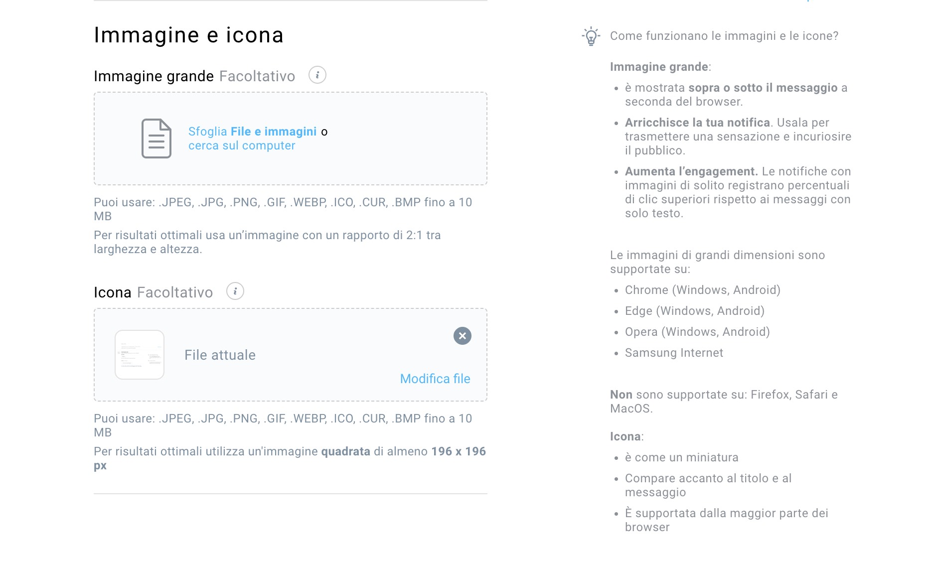 - (Opzionale) Carica un’icona per la notifica. Puoi usare: .JPEG, .JPG, .PNG, .GIF, .WEBP, .ICO, .CUR, .BMP fino a 10 MB. Per ottenere i migliori risultati, usa un’immagine quadrata di almeno 196 x 196 px.