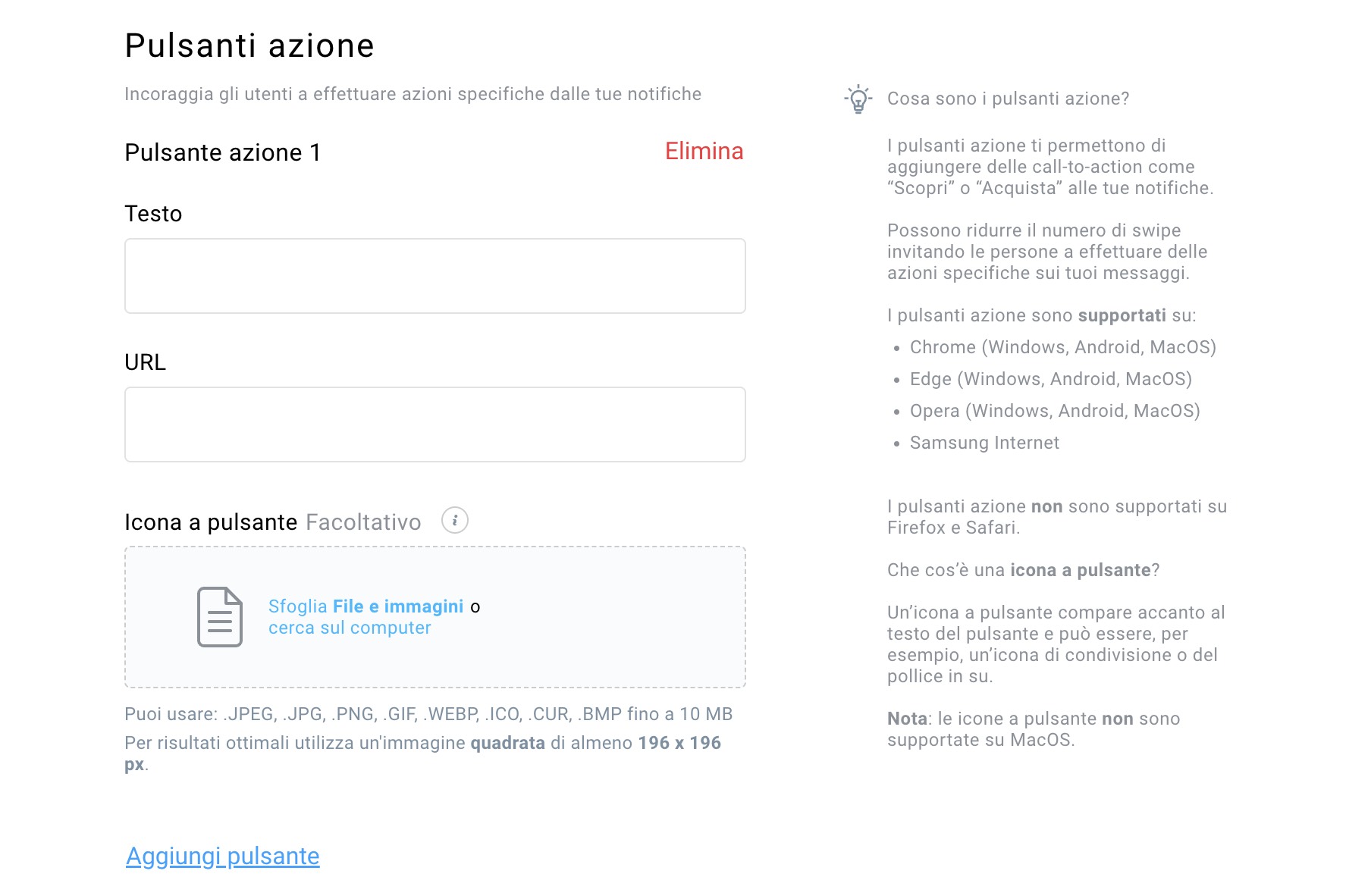 - (Opzionale) Clicca su Aggiungi per creare pulsanti di azione che consentano ai visitatori di eseguire azioni specifiche dalle tue notifiche. Poi inserisci il testo da visualizzare sul pulsante, incolla l’URL che si aprirà al clic del pulsante e l’icona del pulsante che apparirà accanto al testo.