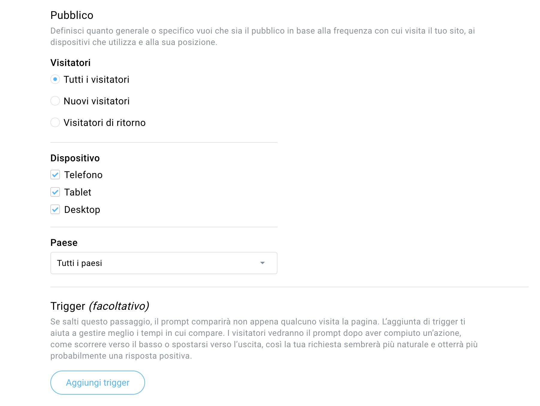 - Nella sezione Audience, puoi configurare i tuoi prompt per mostrarli a gruppi specifici di utenti. La sezione è divisa in tre parti: