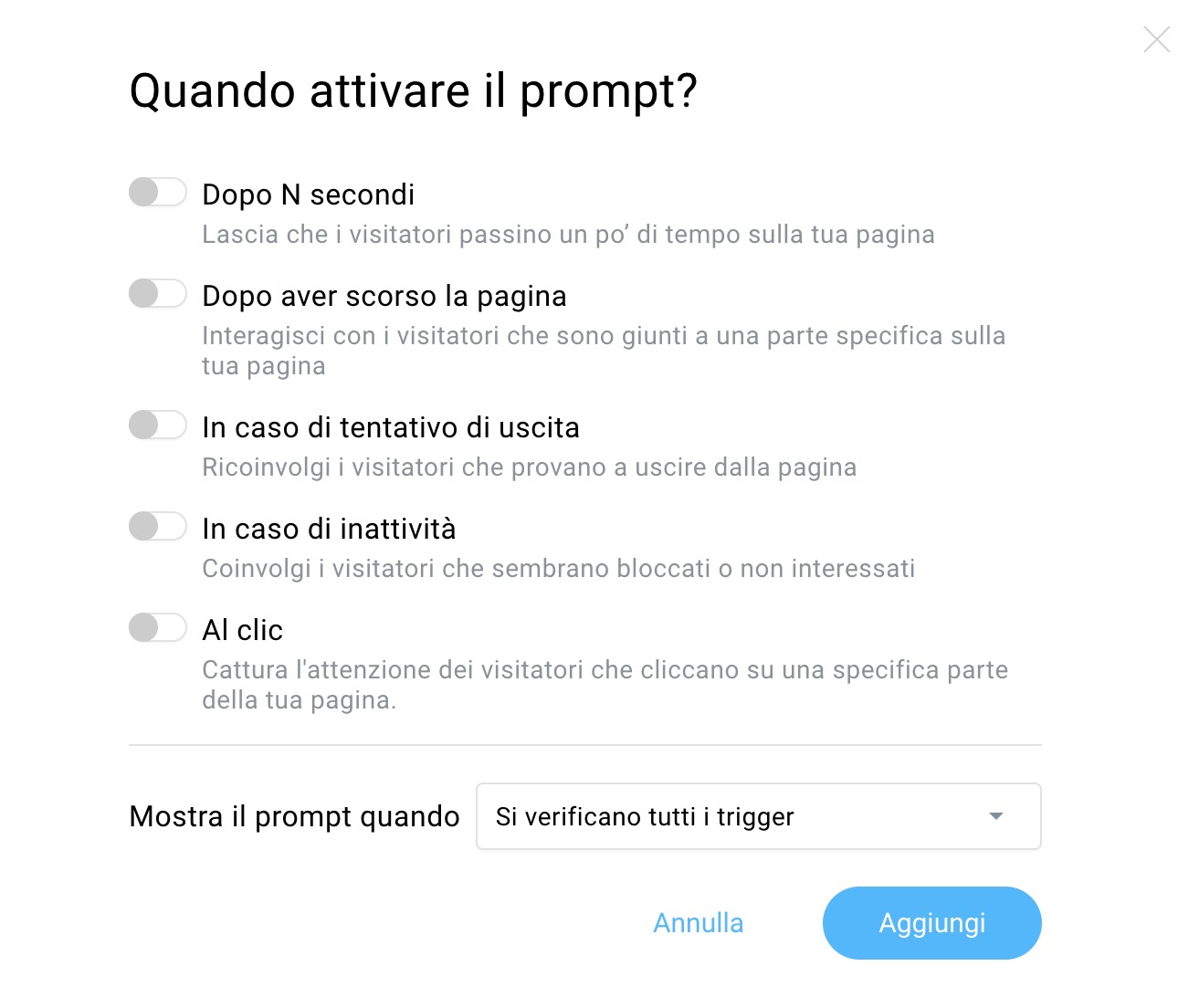 Devi scegliere se il prompt deve essere mostrato quando tutti i trigger selezionati si verificano o se è sufficiente che si verifichi uno qualsiasi dei trigger.