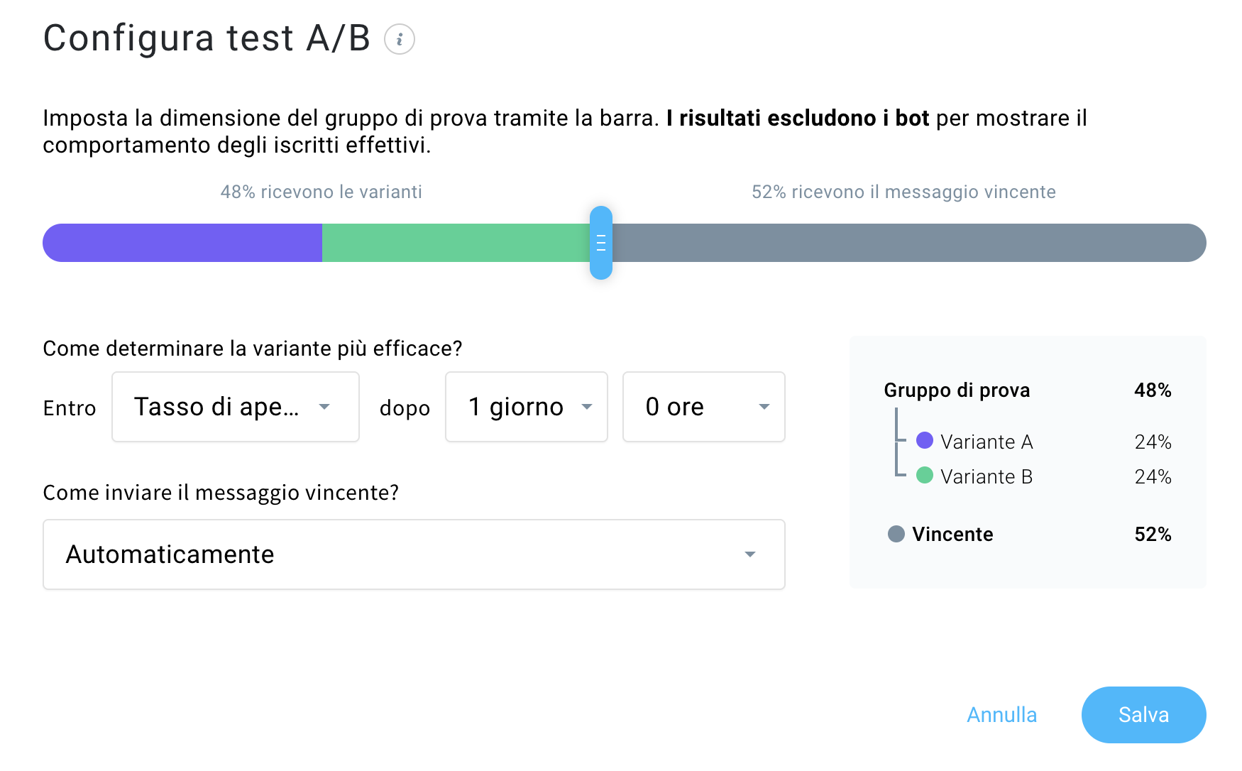 Nota: Durante la fase di test, verranno considerati solo i comportamenti effettuati da utenti reali. Aperture o clic generati dai bot non saranno inclusi. - Seleziona se desideri che il messaggio vincente venga inviato automaticamente al resto del gruppo oppure se preferisci farlo manualmente (applicabile solo se meno del 100% dei contatti viene selezionato per il test).
