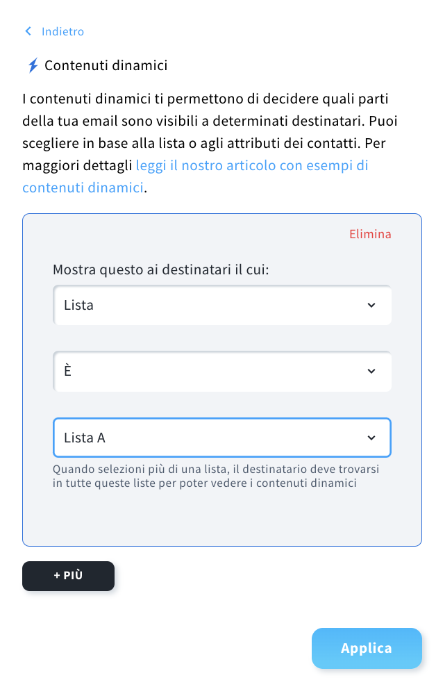 Come mostrare dinamicamente parti del messaggio in base a tag, campi personalizzati o le liste?