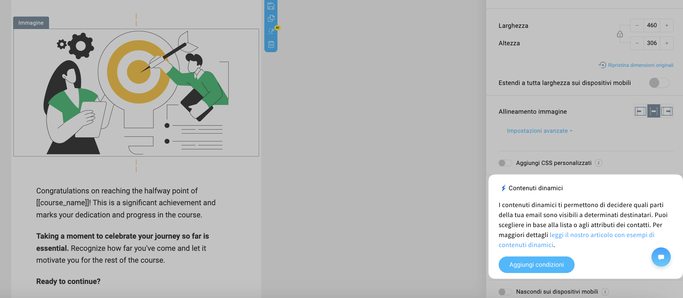 Il contenuto dinamico ti consente di mostrare elementi del tuo messaggio ai destinatari che soddisfano determinati criteri. Ad esempio, puoi visualizzare offerte personalizzate, saluti o consigli sui prodotti in base ai tag e ai campi personalizzati delle persone.