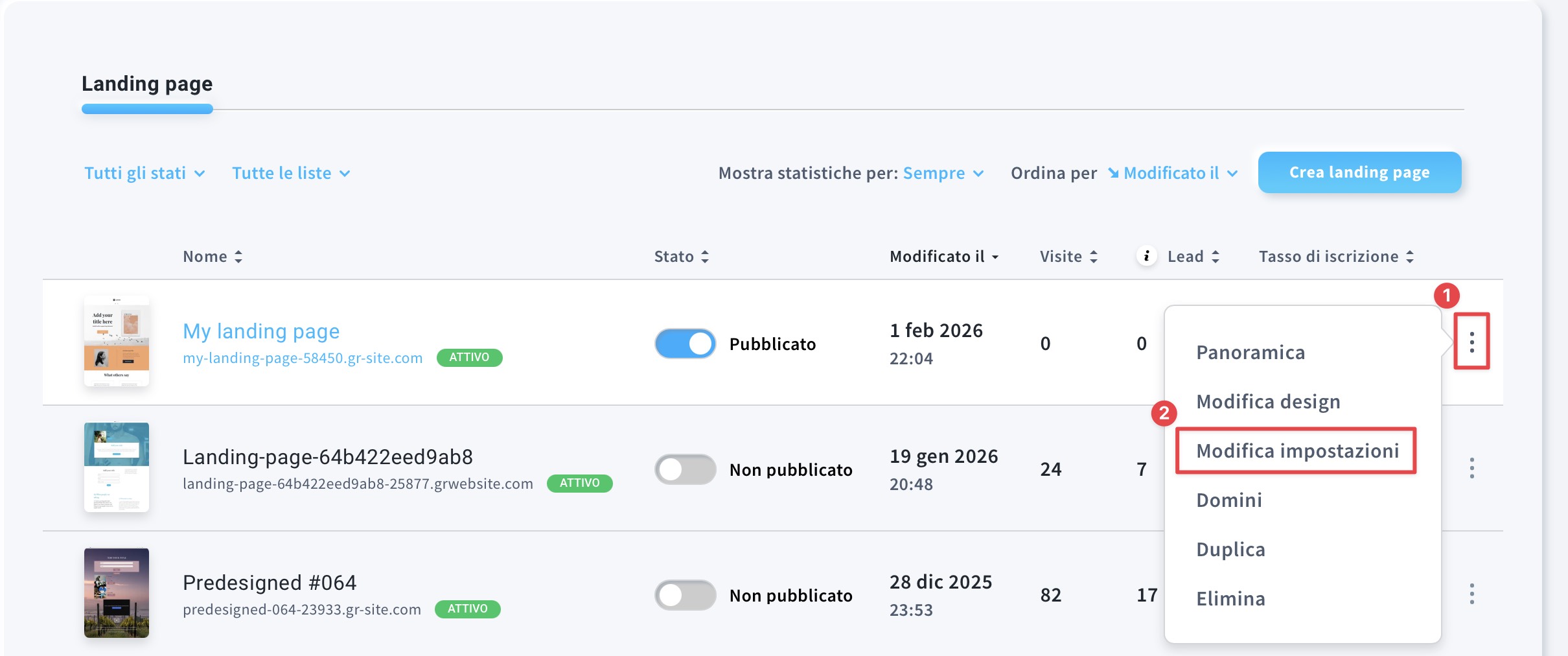- Selezioni la Sua pagina di destinazione, passi il mouse sopra il menu delle azioni e scelga Modifica impostazioni.