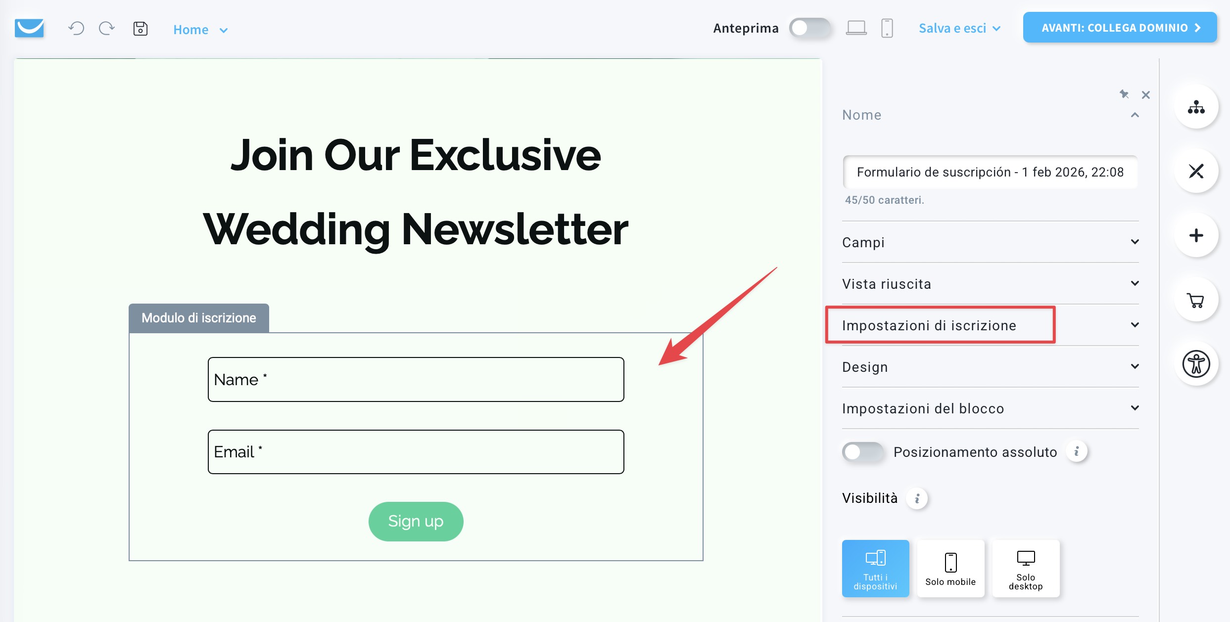 - Fai clic sull’elemento del modulo di iscrizione ed espandi la scheda Impostazioni di iscrizione.