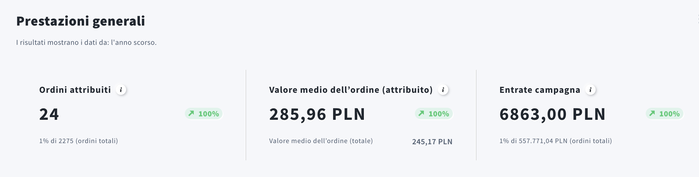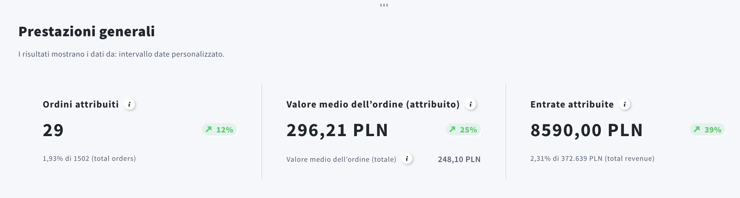 Ordini attribuiti è il numero di ordini pagati dalle campagne ecommerce selezionate e nel periodo scelto.