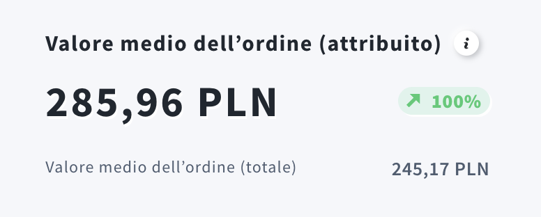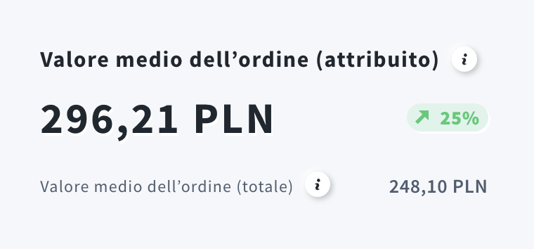 Valore medio dell’ordine (attribuito) è il ricavo attribuito diviso per il numero di ordini attribuiti. Mostra l’importo medio speso per ordine influenzato da GetResponse. Usa questa metrica per valutare i prezzi e l’impatto di strategie come cross-selling, sconti e spedizione gratuita.