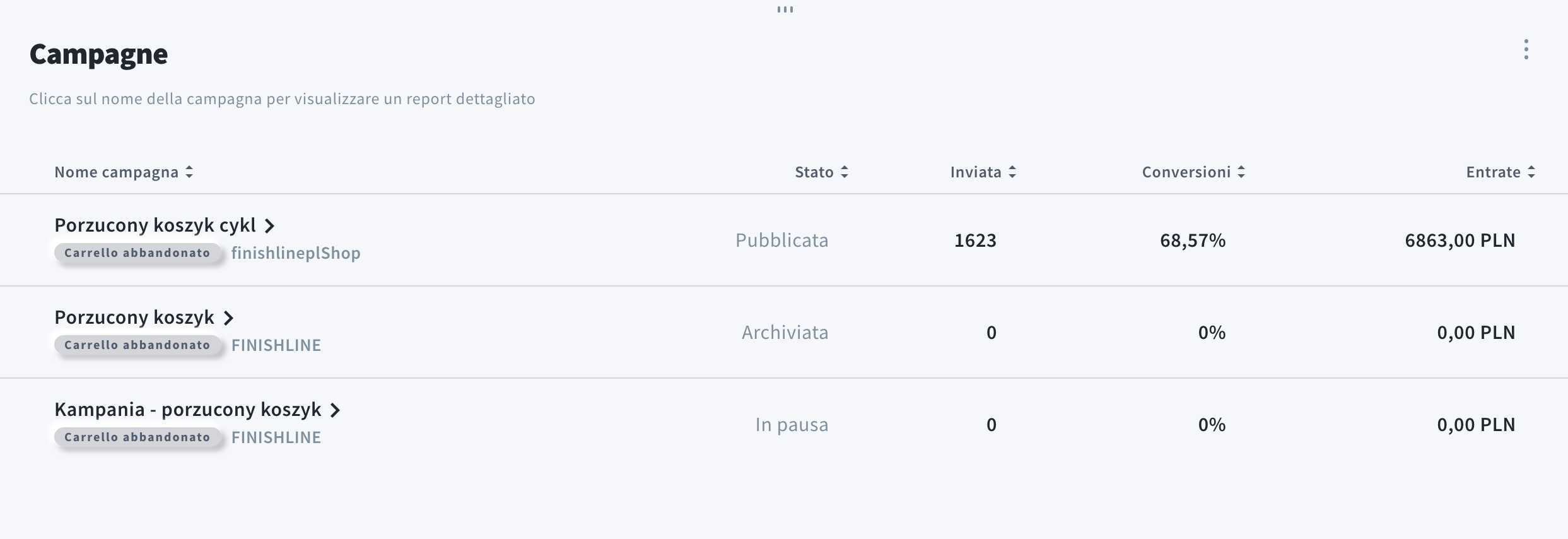 - Conversioni mostra la percentuale di carrelli abbandonati recuperati con successo