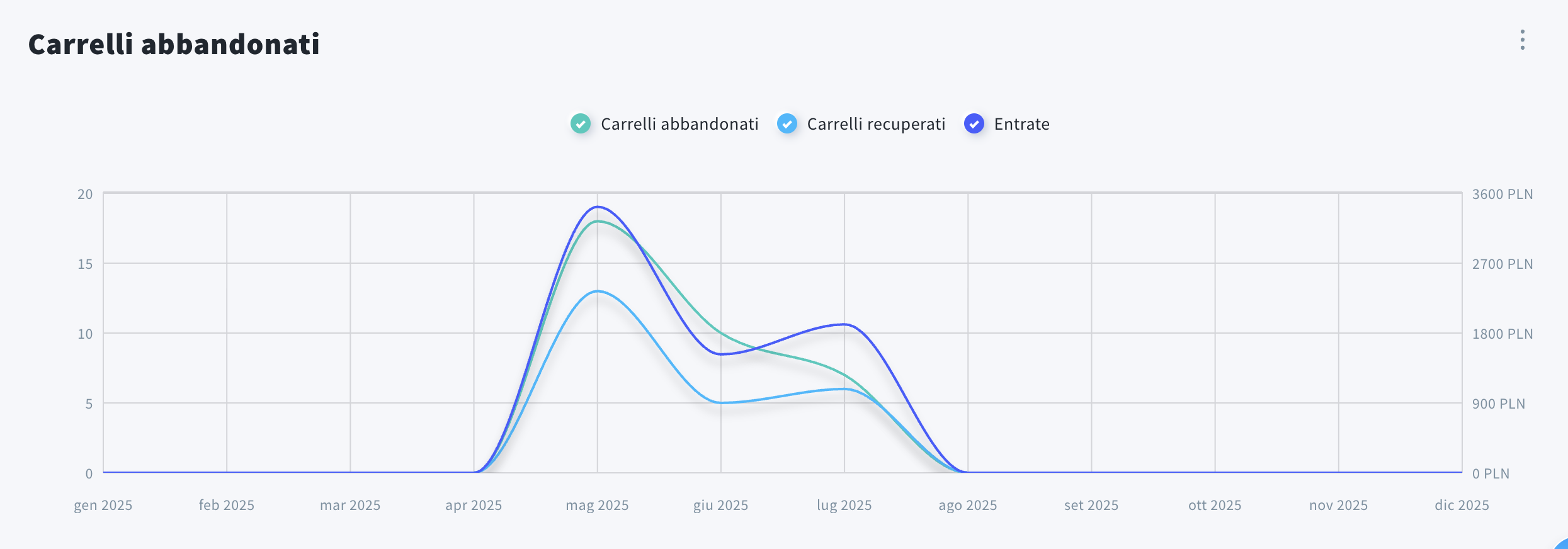 Grafico progettato per monitorare visivamente nel tempo le performance di recupero dei carrelli abbandonati. Puoi trovare tre linee nel grafico (puoi mostrarle/nasconderle facendo clic sui loro nomi):