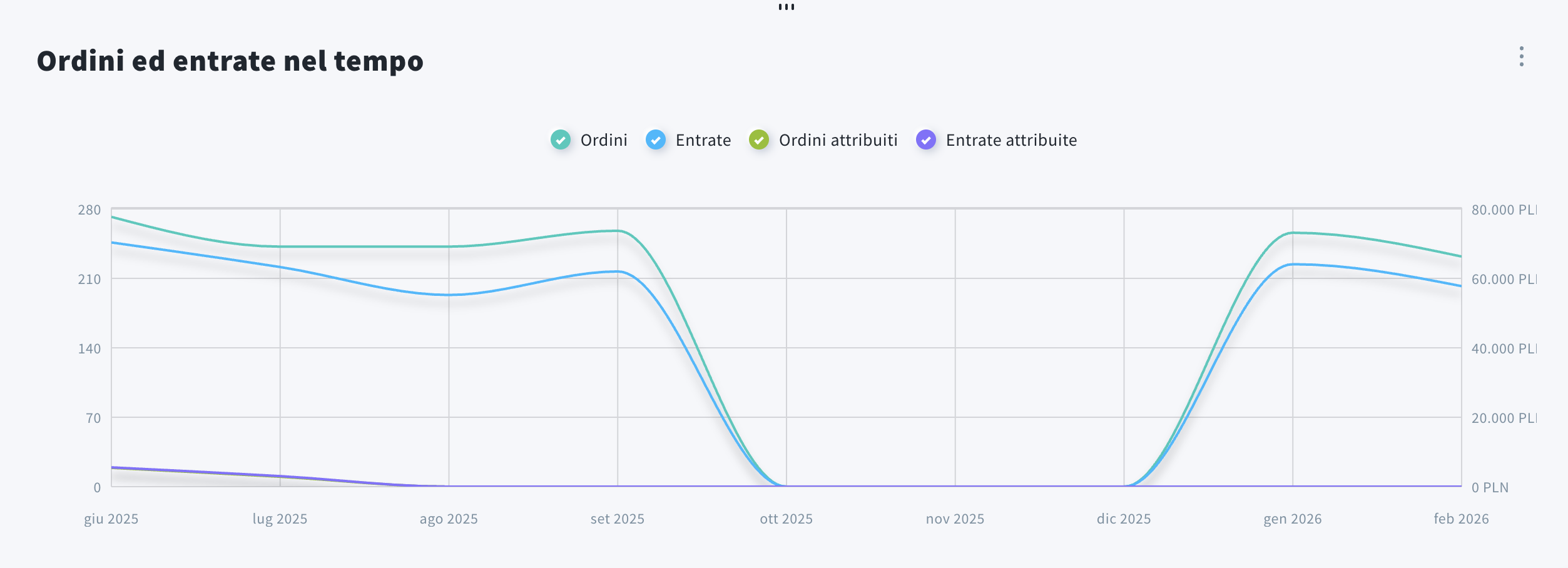 Qui puoi visualizzare un grafico per monitorare visivamente l’andamento di ordini e ricavi nel tempo. Puoi trovare quattro linee nel grafico (puoi mostrarle/nasconderle facendo clic sui loro nomi):