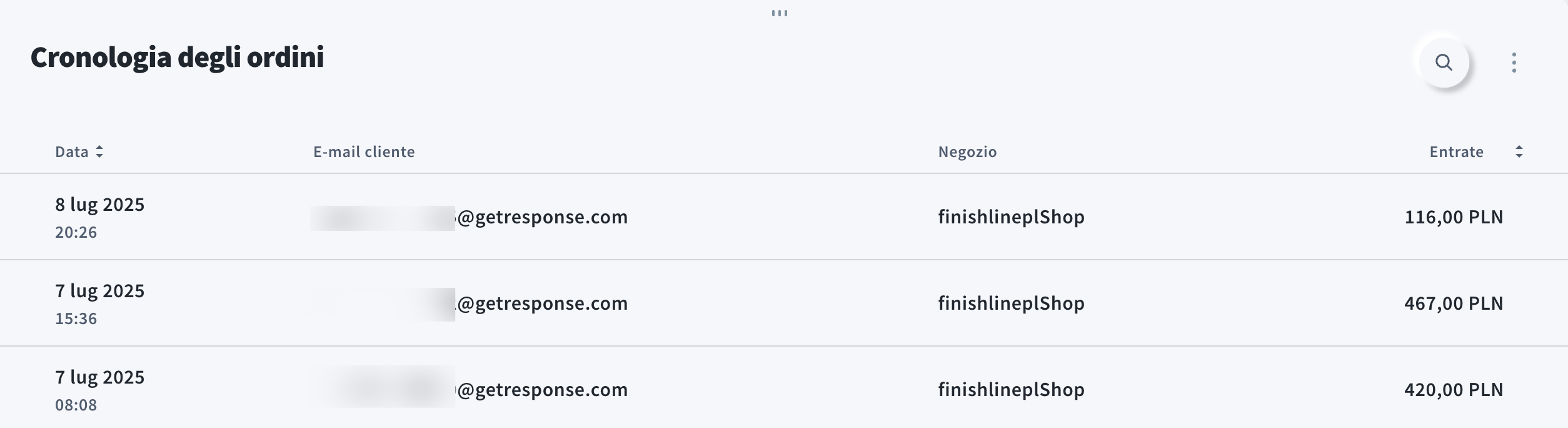 Questo è l’elenco completo di All Orders effettuati nell’intervallo di tempo selezionato. Contiene la date dell’ordine, l’email del customer, il store name e il revenue.