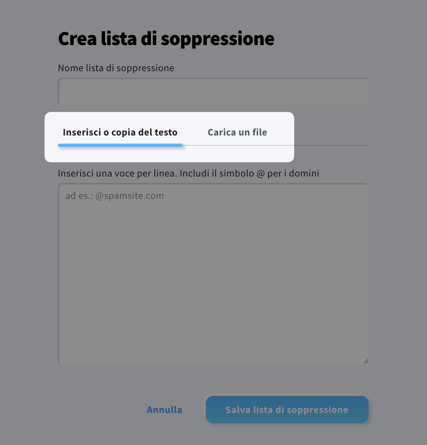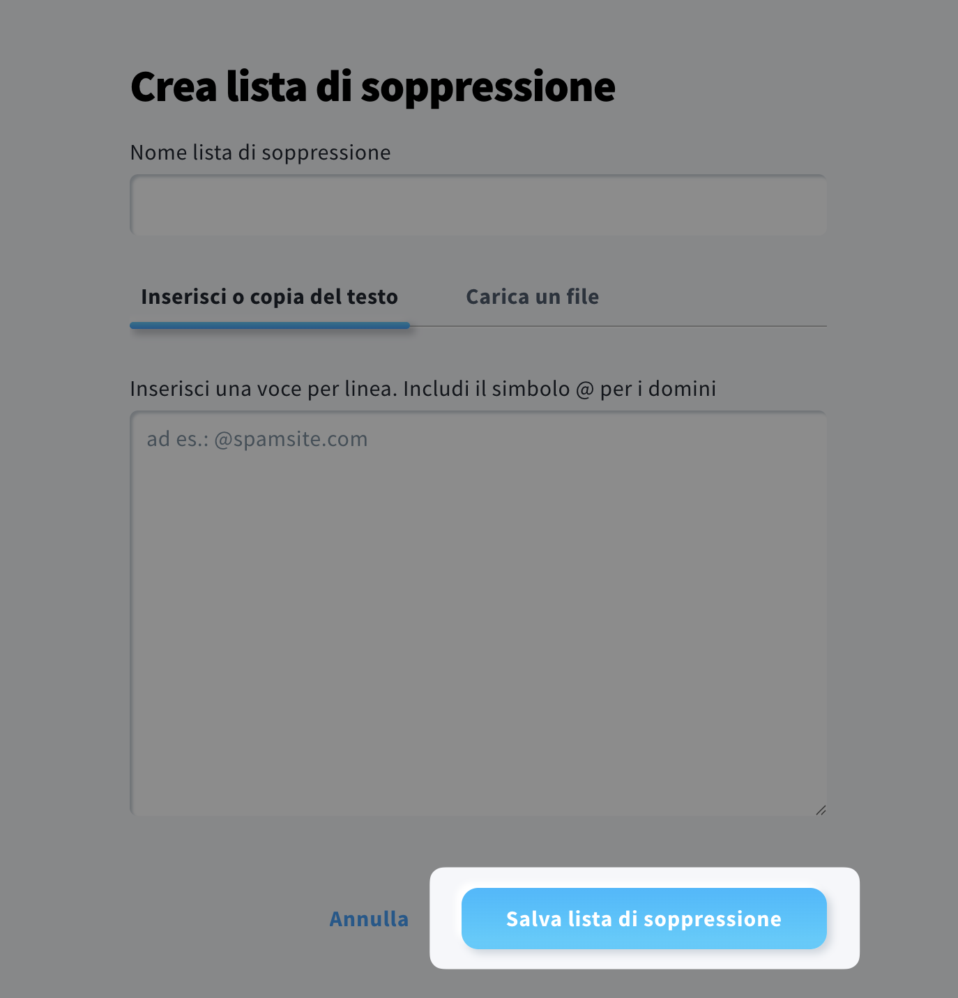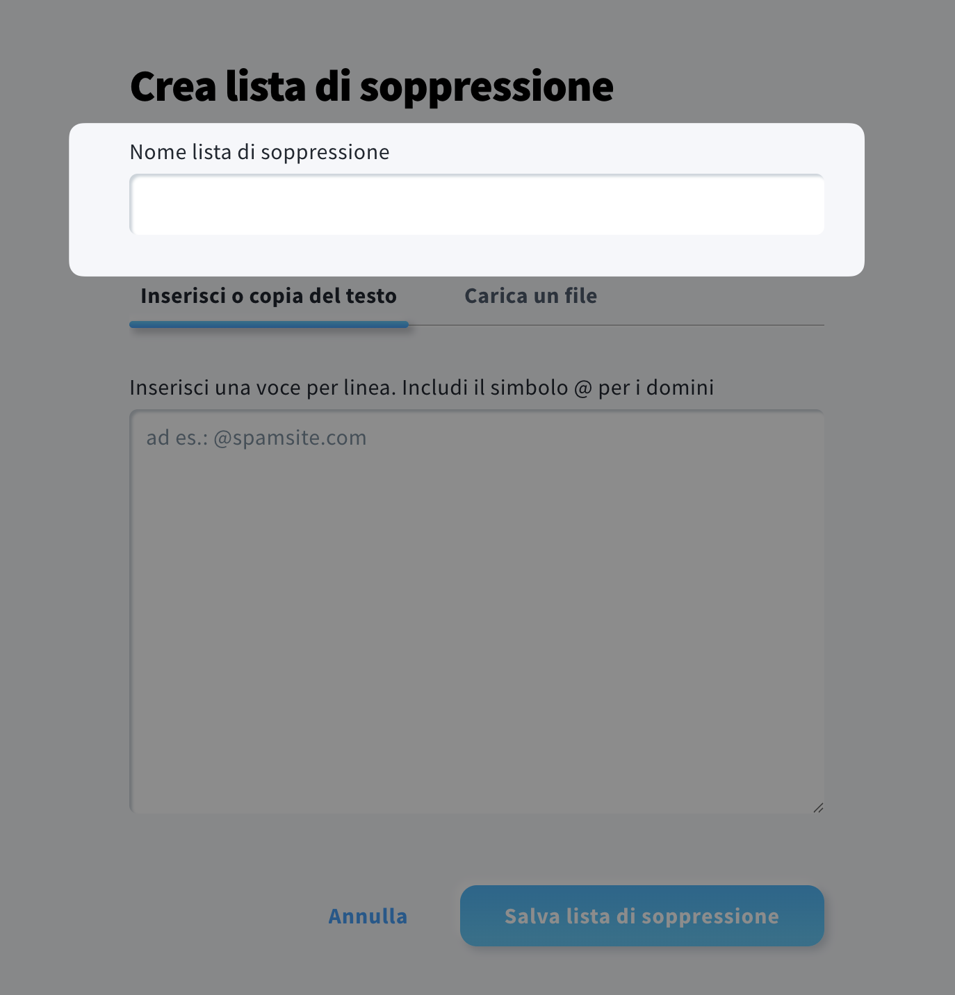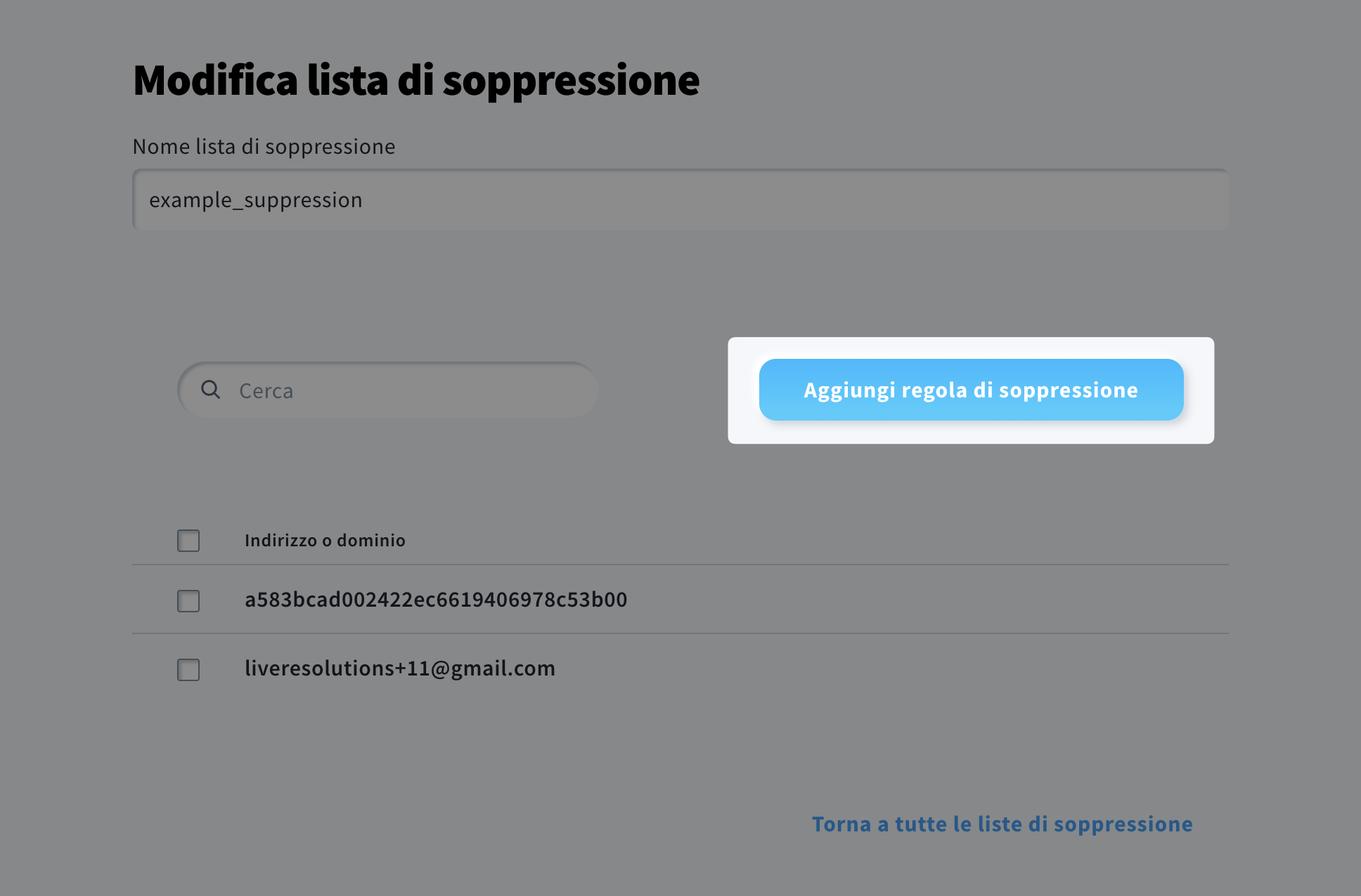 Una lista di soppressione consente di escludere determinati indirizzi email o domini dalla ricezione delle tue campagne, anche se fanno ancora parte della tua lista email principale. Puoi utilizzarle per preservare la tua reputazione del mittente, rispettare tempestivamente le richieste di disiscrizione ed evitare l’invio a indirizzi email non validi o rischiosi.