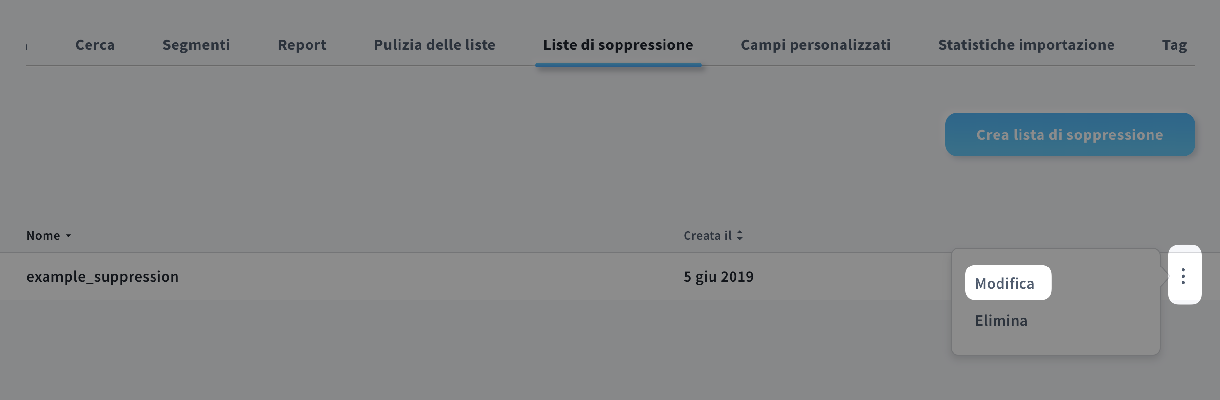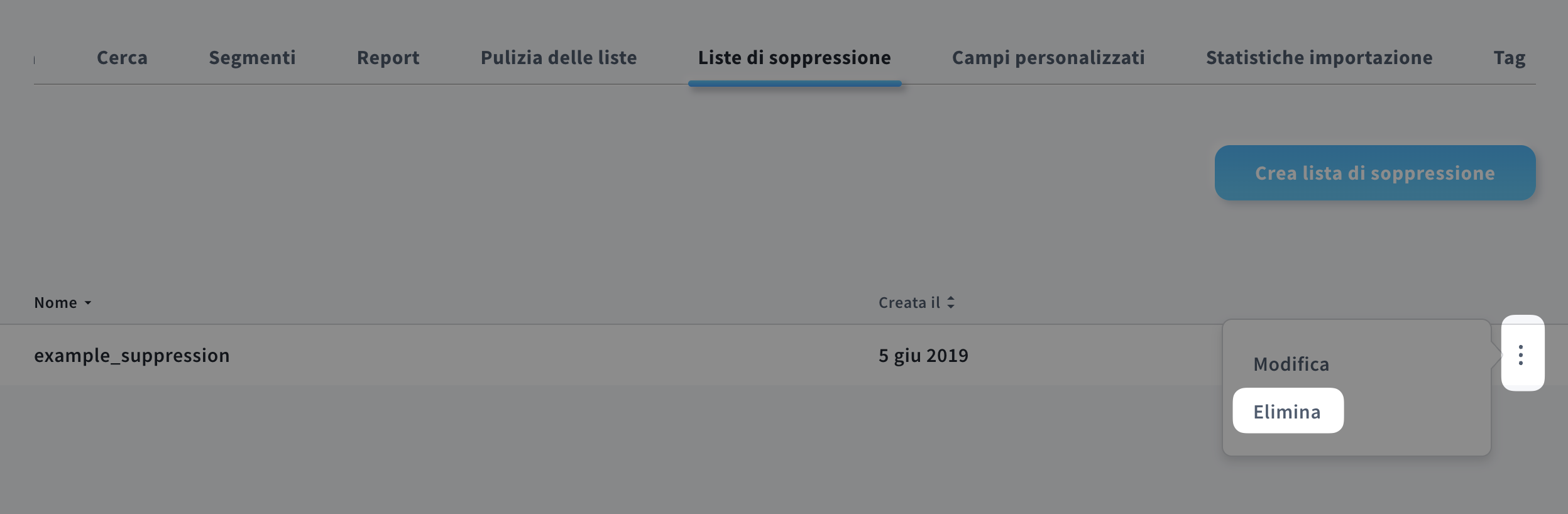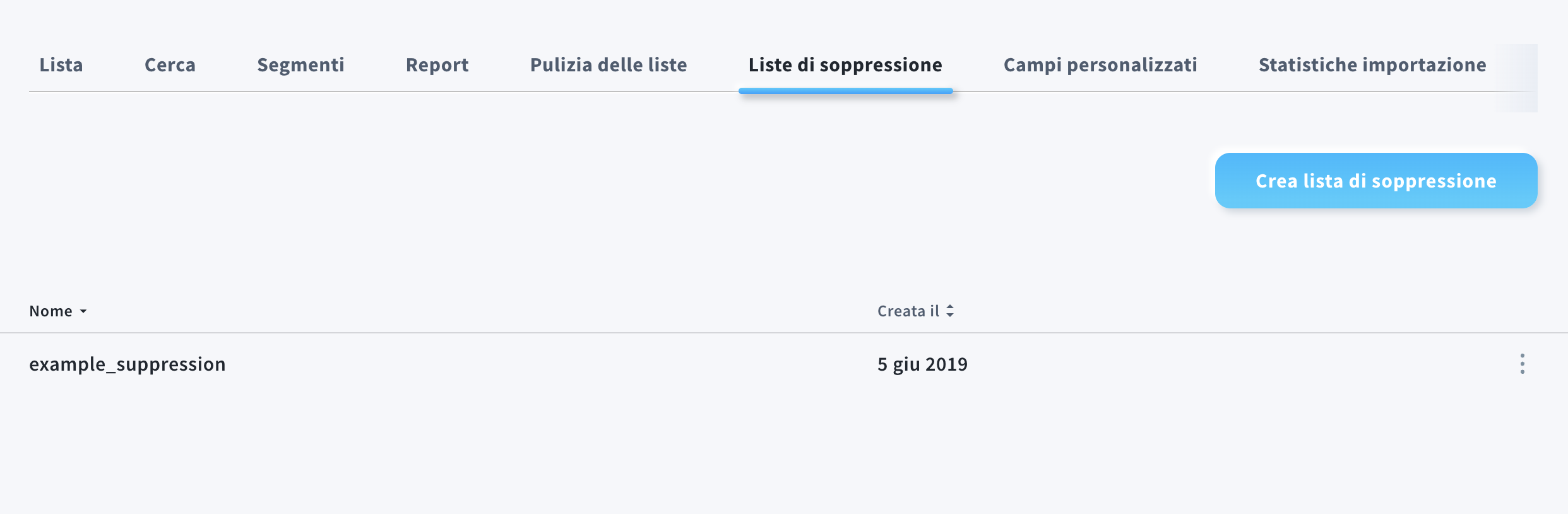 Dopo aver creato con successo una lista di soppressione, verrai automaticamente reindirizzato alla pagina Liste di soppressione.