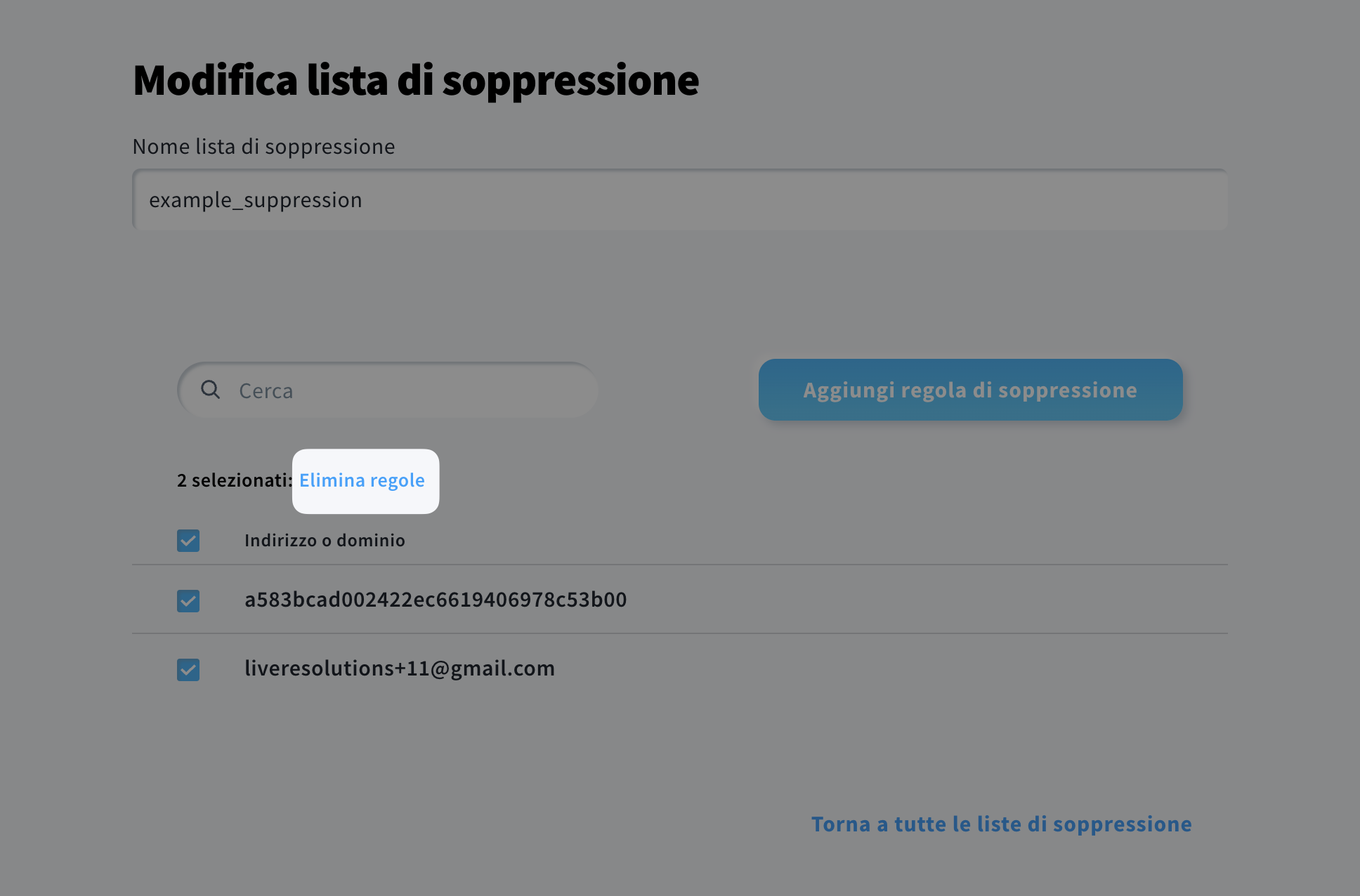 Le regole di soppressione possono essere utilizzate per escludere email o domini. Puoi usare le seguenti regole: